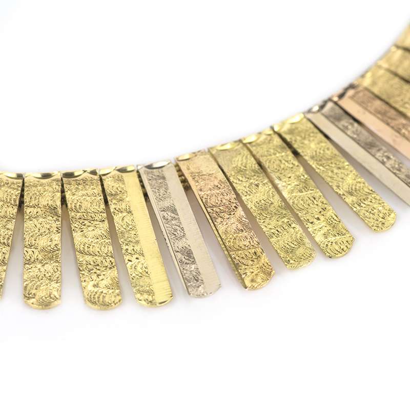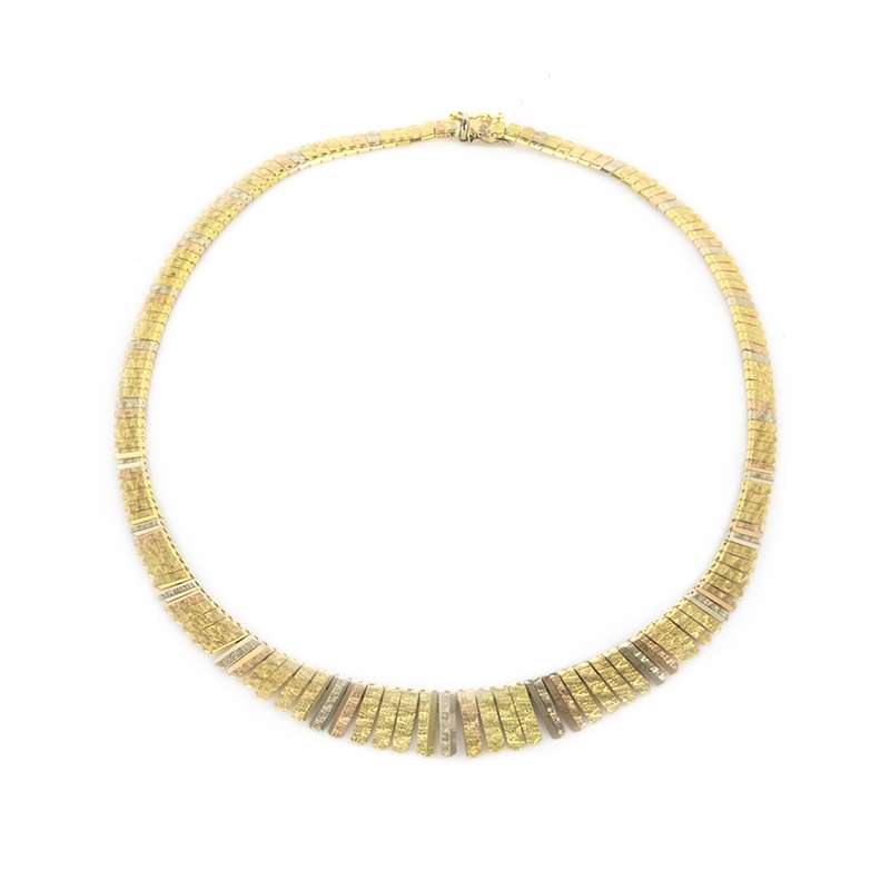 An 18k three colour gold necklace. Of fringe design, the necklace is made up of alternating polished 18k yellow, white and rose gold pillar design intersections. The necklace is 16 inches in lengh joined by a tongue clasp and safety clasp. The gross weight is 29.30 grams.