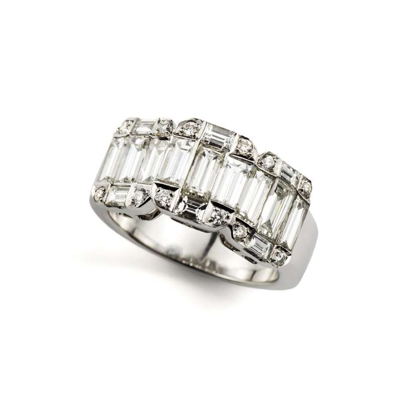 18k White Gold Rubover set Baguette and Round Brilliant cut Diamond ring, total Diamond Weight 2.31ct, G/H Colour, VS Clarity. Current Finger Size O but can be adjusted for a perfect fit.