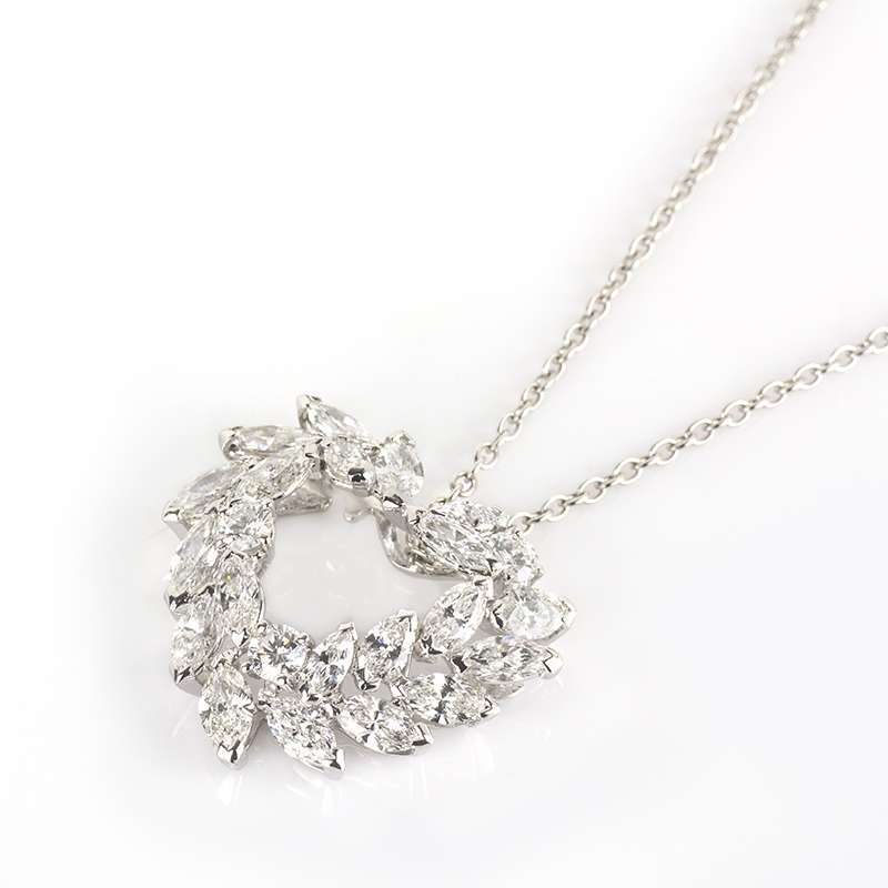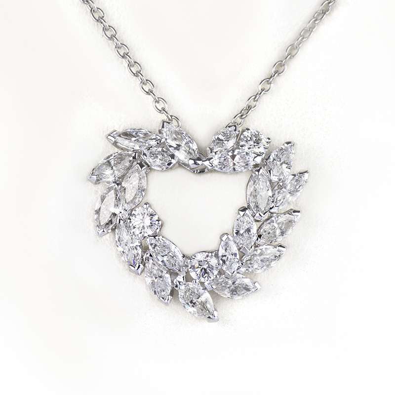 A modern 18k white gold diamond set heart shape pendant. The pendant is made up of 19 marquise cut diamonds and 3 round brilliant cut diamonds totalling approximately 3.20ct. The diamonds are predominantly H in colour and VVS2 in clarity. The pendant comes on an 18k white gold 18 inch chain and has a gross weight of 7.46 grams.