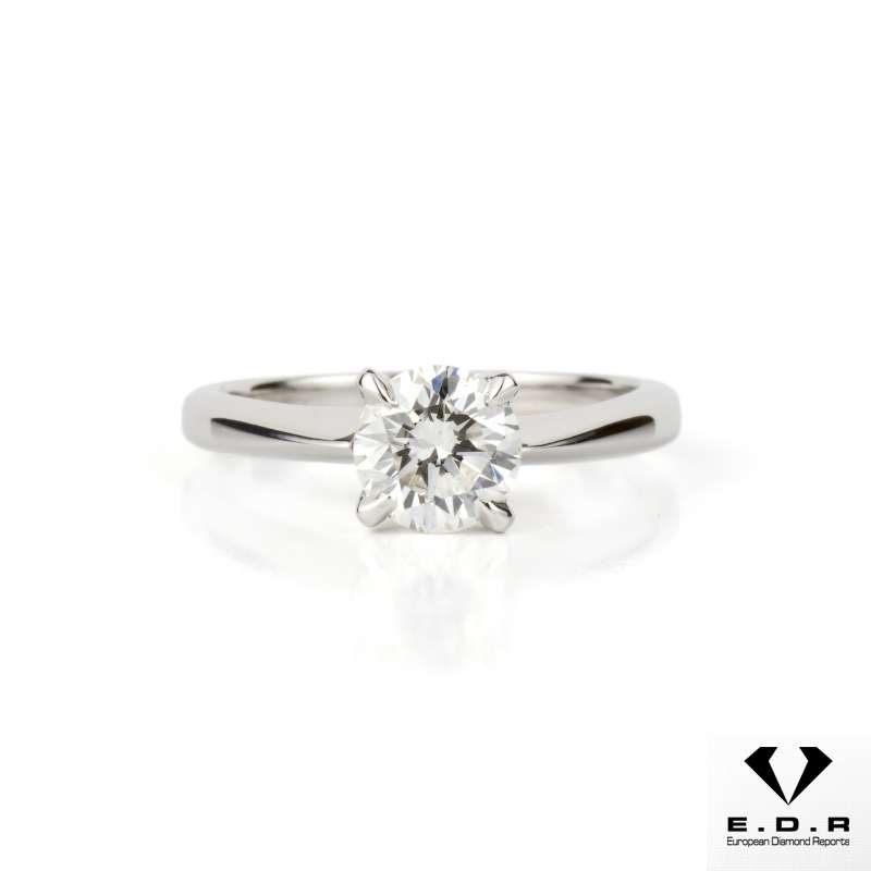 An 18k white gold single stone diamond ring. The centre round brilliant cut diamond is set within a classic 4 claw setting. The diamond is 0.88ct, G colour and SI1 clarity. the ring is currently a finger size J 1/2 but can be adjusted for a perfect fit.
