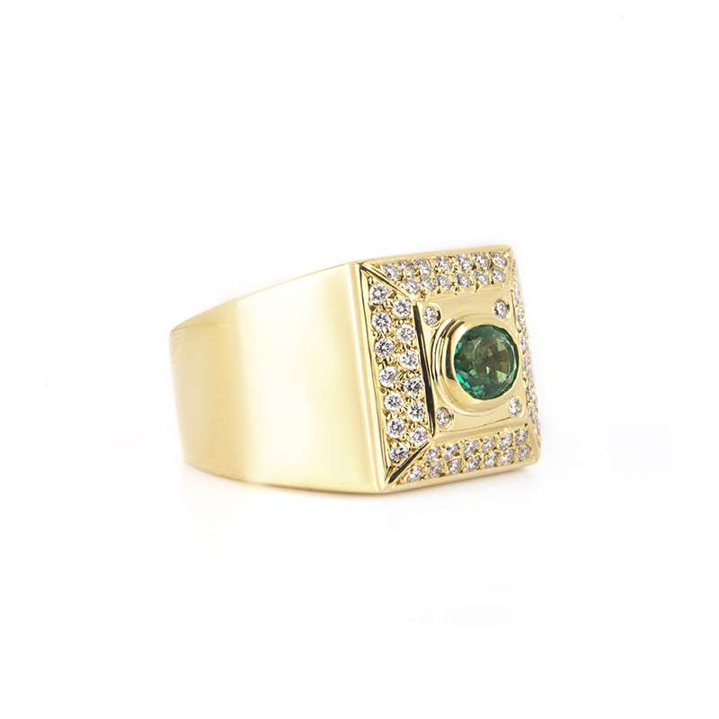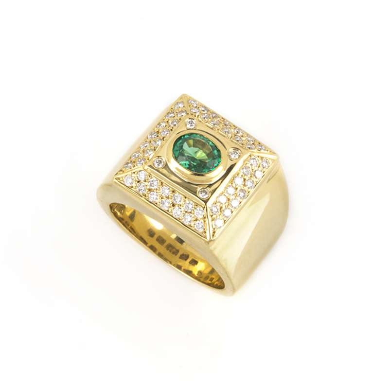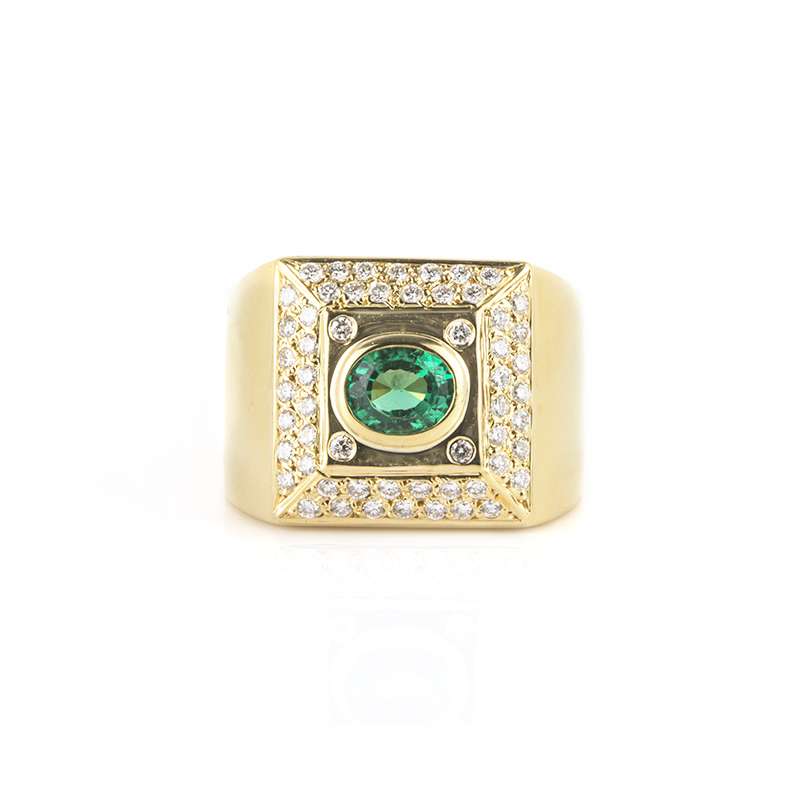 An 18k yellow gold diamond and emerald dress ring. The ring features a square design set to the centre with an oval cut emerald weighing 0.50ct. In each 4 corners of the inner square sit a single round brilliant cut diamond, along with 54 pave set, round brilliant cut diamonds all totalling 0.32ct, I/SI making up the outer square. The ring is currently a size O and has a gross weight of 3.66 grams.