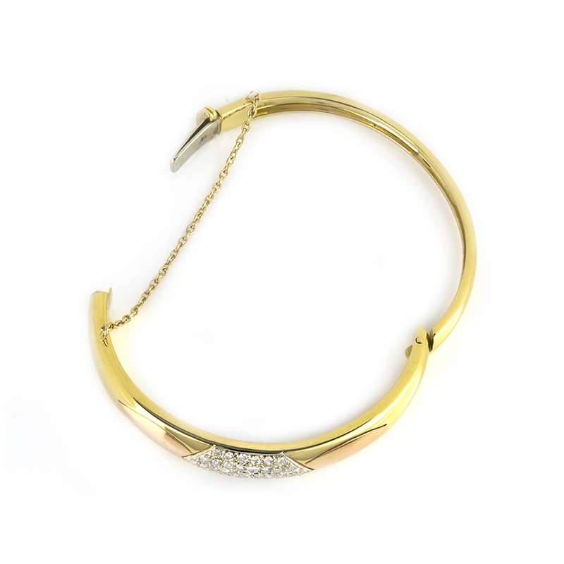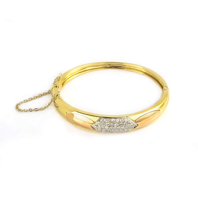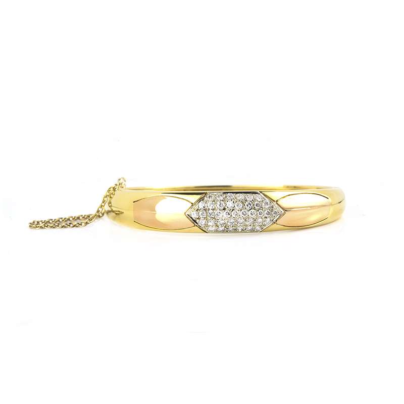 An 18k yellow gold diamond set bangle. The bangle is set to the centre with pave set, round brilliant cut diamonds totalling approximately 1.00ct, colour G and VS/SI clarity. Either side of the diamonds sits an 18k rose gold cross section. The bangle would fit a wrist of up to 17cm and has a gross weight of 28.30 grams.