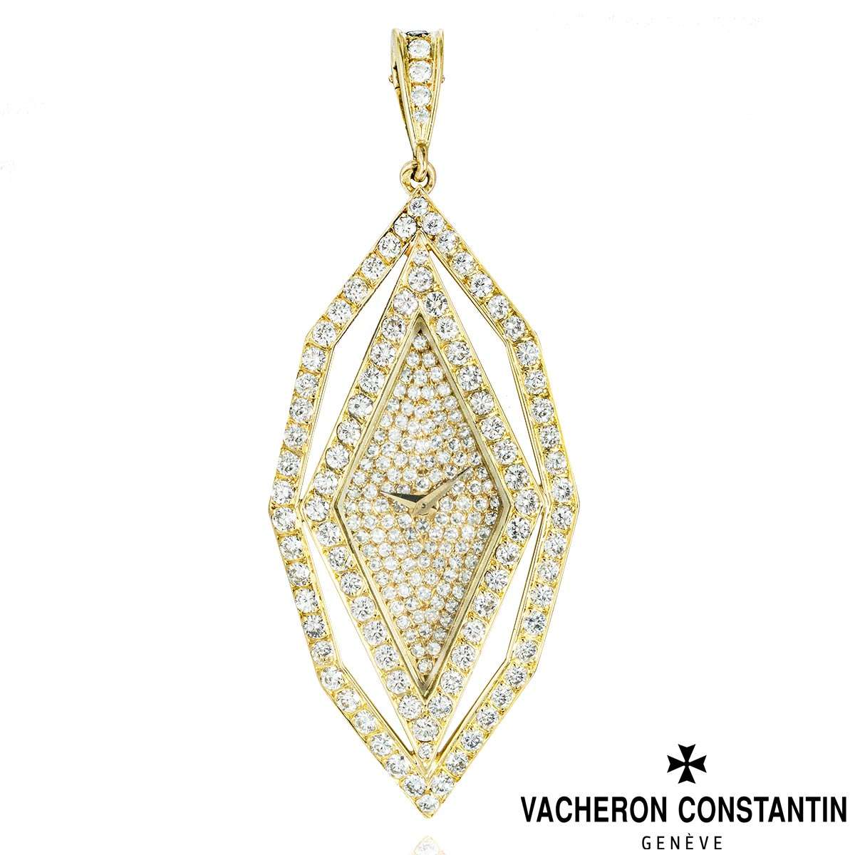 Case: This wonderful 18ct yellow gold heart shape case, beautifully engraved, set with a lovely emerald, surrounded with nine old cut diamonds to the front cover. The rear cover is also beautifully engraved with a garland of flowers surrounding a vacant cartouche. The front cover opens to reveal the dial when the pendant is depressed. The inner cover is engraved with the word Geneve with an explanation stating that the movement has a cylinder escapement and an arrow showing which way to wind the watch.
