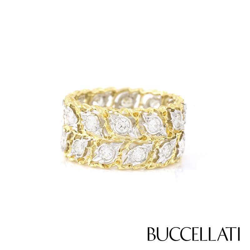 A Buccellati 18k yellow and white gold diamond dress ring. The open work floral design has 2 rows of round brilliant cut diamonds set in an 18k white gold leaf with a total carat weight of 1.20ct, colour F and VS2 clarity. The ring is currently a size K and has a gross weight of 4.99 grams.