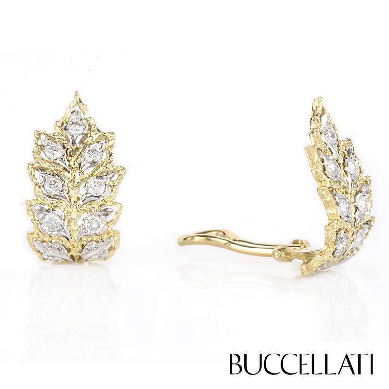A pair of Buccellati 18k yellow and white gold diamond earclips. Each open work floral design earclip is set with 7 round brilliant cut diamonds set in an 18k white gold leaf, the total diamond weight is 0.70ct, colour F and VS2 clarity. The earclips are 2.5cm in length and 1cm in width and the gross weight is 9.04 grams.