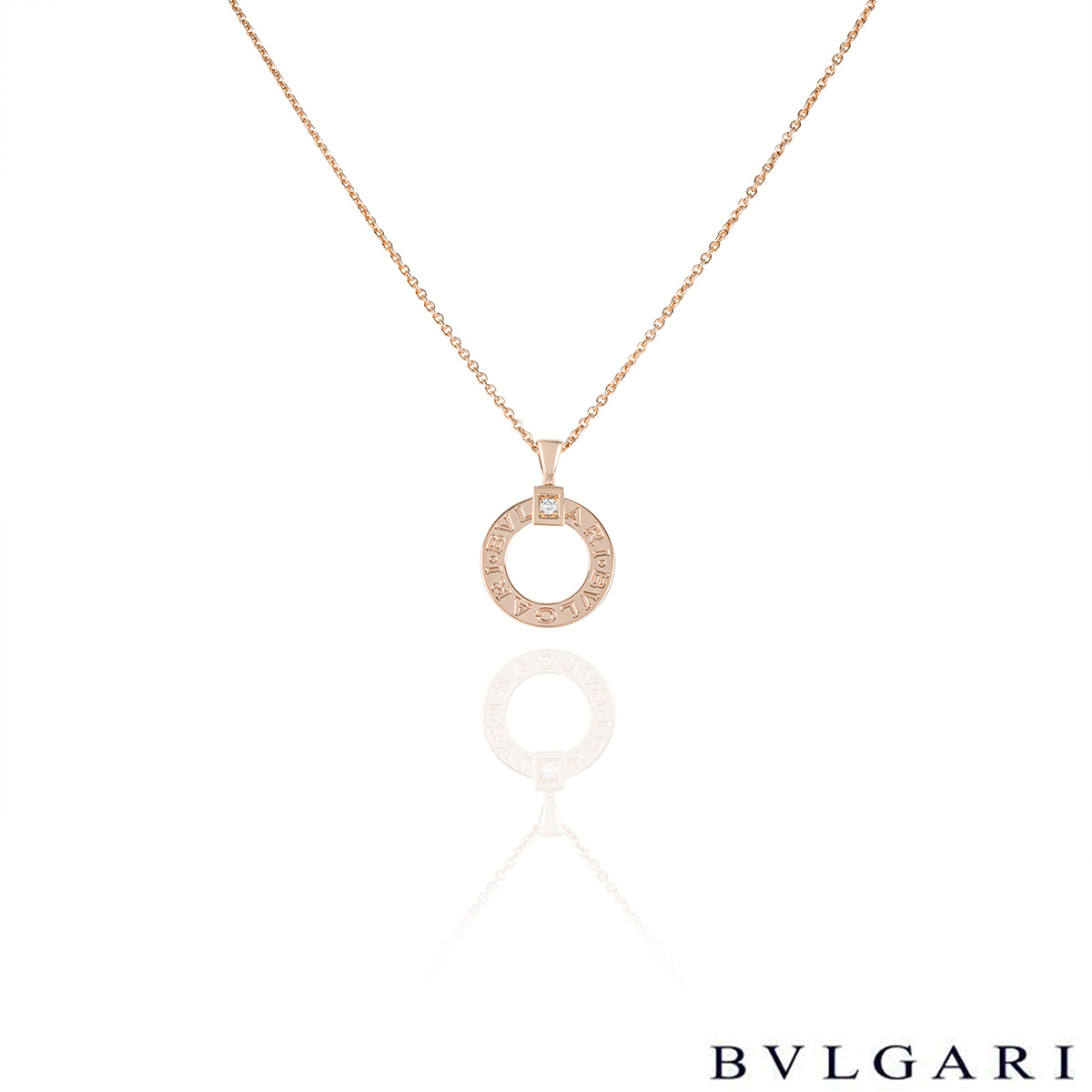 A contemporary 18k rose gold diamond pendant by Bvlgari from the Bvlgari Bvlgari collection. The pendant features a circular openwork motif engraved 'Bvlgari Bvlgari' around the outer edge separated by a single diamond set below the bail. The round brilliant cut diamond has an approximate weight of 0.07ct, F-G colour and VS clarity. The pendant suspends from an adjustable 14-18 inch trace link chain that finishes with a lobster clasp and has a gross weight of 14.11 grams.