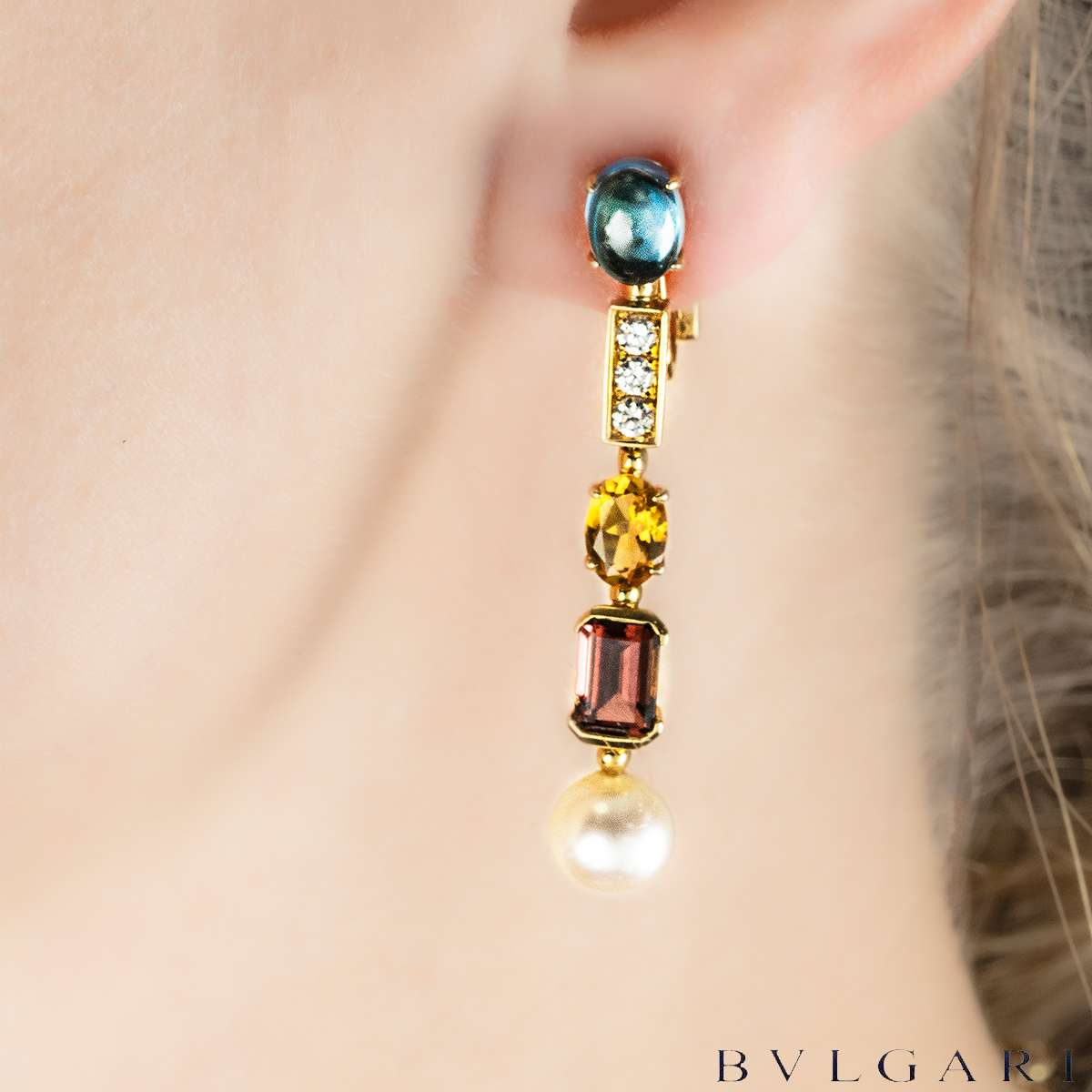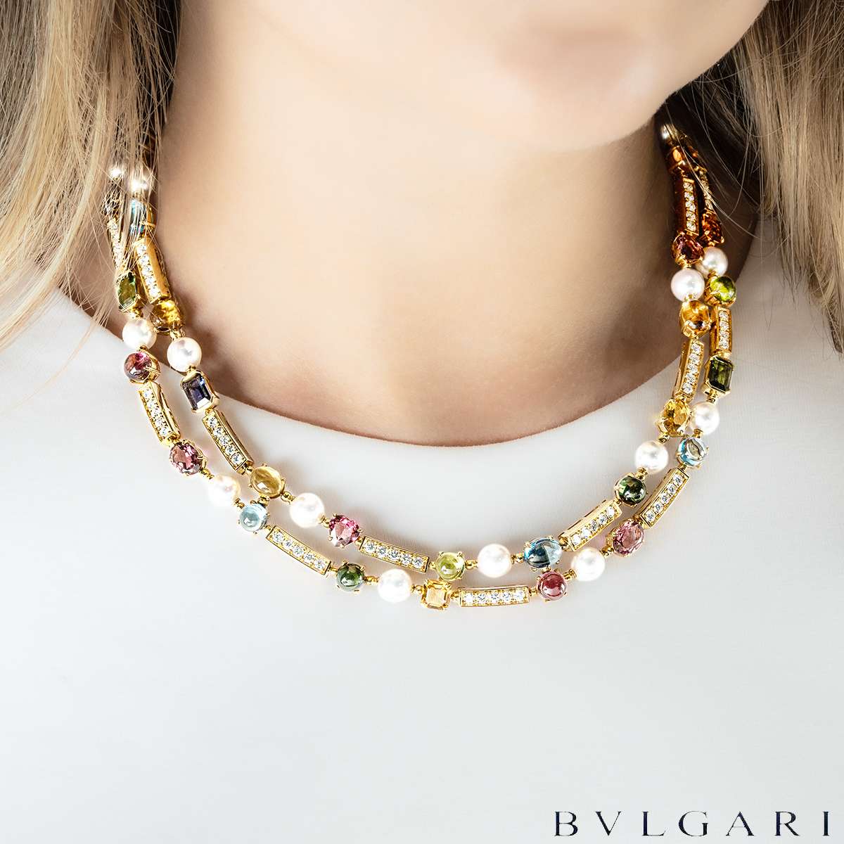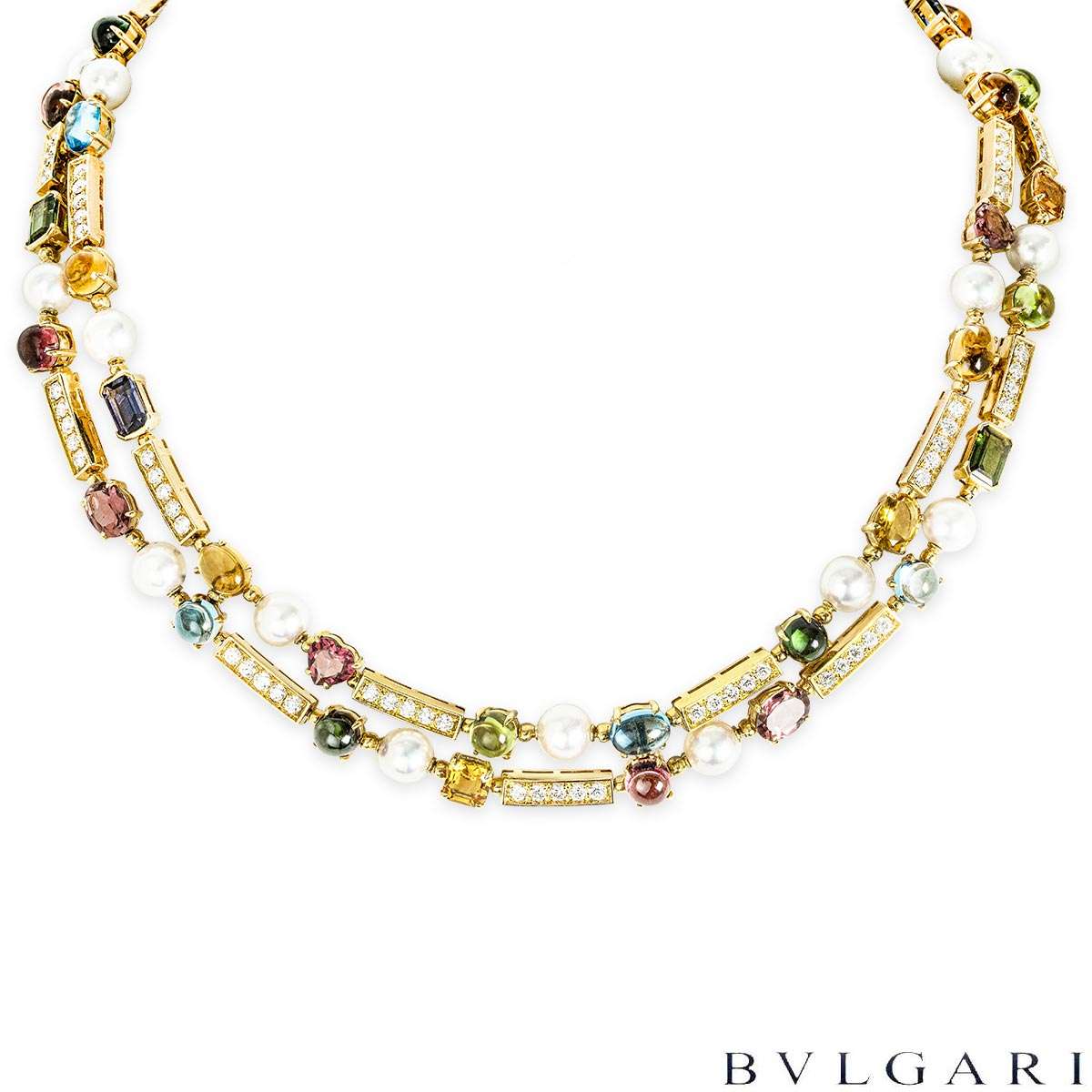 A striking 18k yellow gold multi-gem suite by Bvlgari from the Allegra Coriandoli collection. The suite showcases a vibrant arrangement of tourmalines, peridots, aquamarines, amethysts and citrines in a variety of cuts, 7mm white pearls interspersed with polished gold bar motifs set with 86 round brilliant-cut diamonds totalling approximately 4.35 carats.