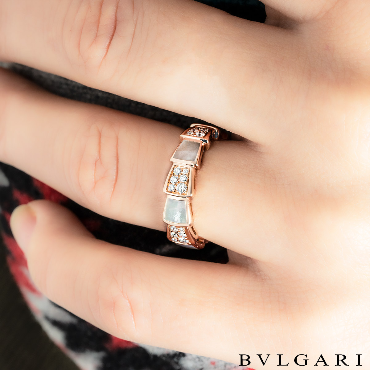 A glamorous 18k rose gold mother of pearl and diamond ring by Bvlgari from the Serpenti collection. The Serpenti Viper ring coils around the finger, comprising of 6 alternating mother of pearl inlay stations and 6 diamond pave set stations. There are 36 round brilliant cut diamonds with an approximate weight of 0.41ct, F-G colour and VS clarity. The 5mm band is a size 52 and has a gross weight of 5.80 grams.