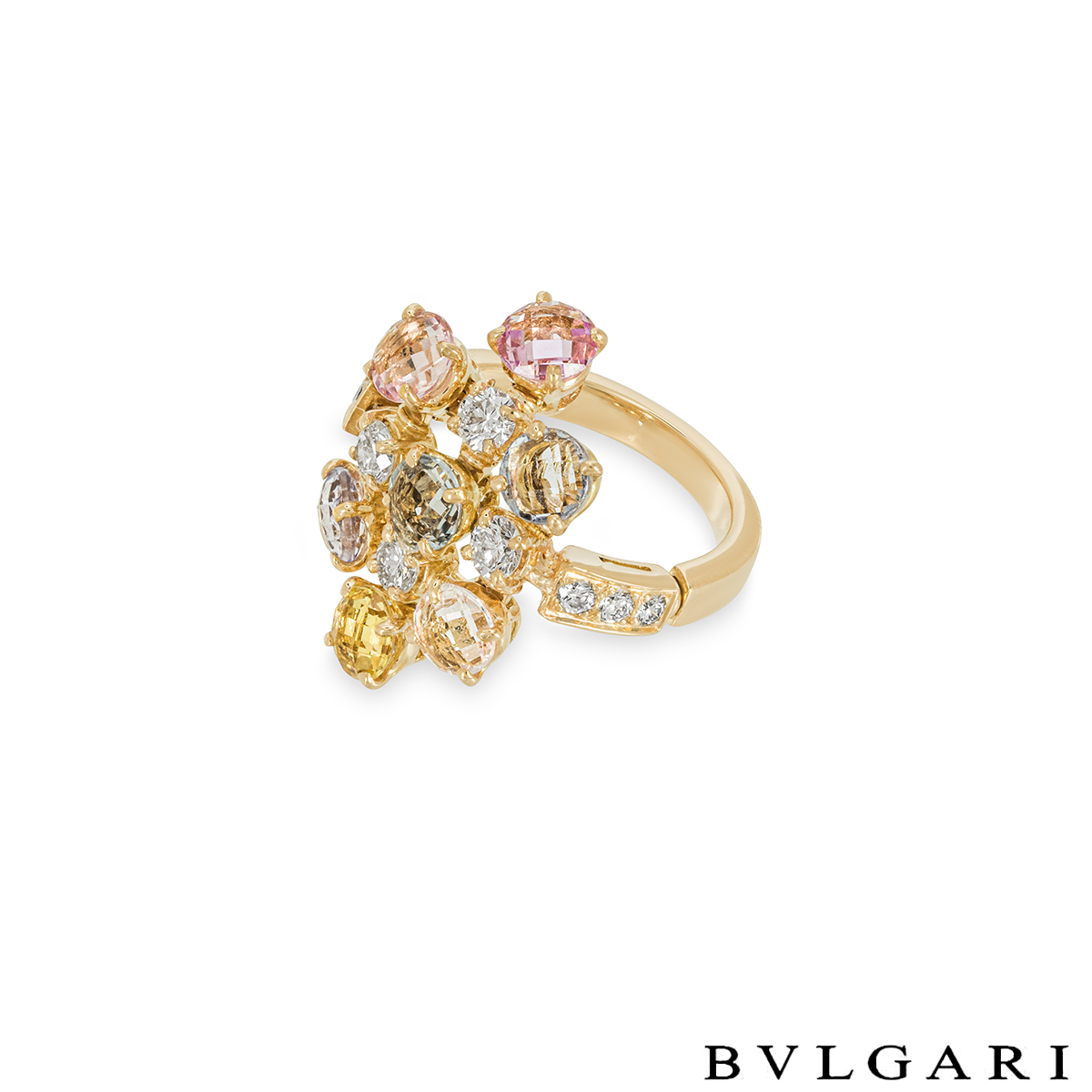 A gorgeous 18k yellow gold multi-coloured sapphire and diamond dress ring by Bvlgari. The ring features a freely moving cluster design made up of 7 round rose cut fancy coloured sapphires and 4 round brilliant cut diamonds set to the centre in a four prong mount. Further complementing the centre motif are 6 round brilliant cut diamonds pave set to the shoulders. The diamonds have an approximate total weight of 0.80ct, G-H colour and VS-SI clarity. The sapphires have an approximate total weight of 2.52ct and display light tones of pink, yellow and blue hues. The ring measures 3mm wide, has a gross weight of 8.56 grams and is currently a size N but can be adjusted for the perfect fit.