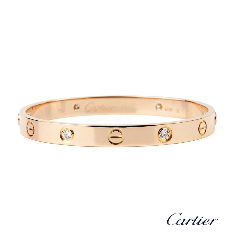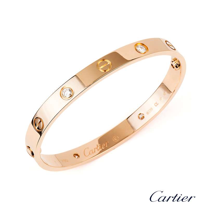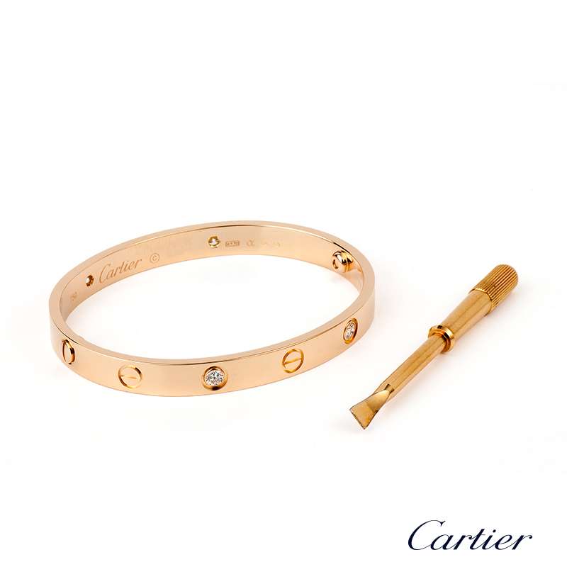 An iconic half diamond Cartier Love bangle in 18k rose gold. The bangle is set with 4 round brilliant cut diamonds, alternating with the signature screw motif. The bangle is a size 17. Cartier model number B6040617. The gross weight is 31.17 grams.