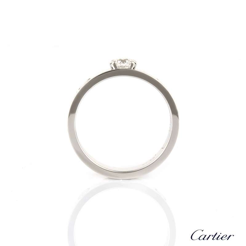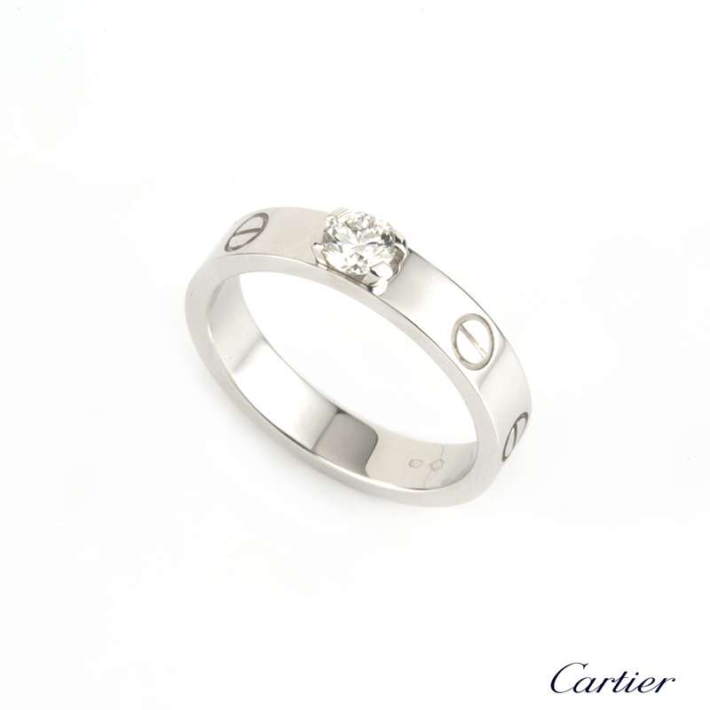 A signature 18k white gold solitaire ring from the Cartier Love collection. The ring has the classic Cartier screw motif around the outer edge and a single round brilliant cut diamond weighing 0.26ct, the colour is E and the clarity is IF. The ring is a size 53 and has a gross weight of 4.64 grams.