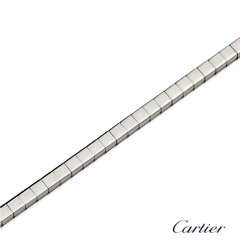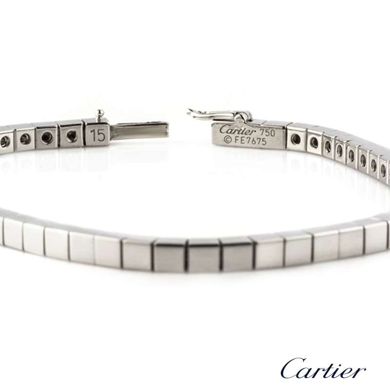 A classic 18k white gold Cartier Lanieres bracelet. The bracelet comprises of 55 square flexi links, complete with a discrete tongue and groove clasp in a highly polished finish. It is discretely engraved with the iconic Cartier motif near to the tongue and measures 6.5 inches in length with a gross weight of 16.10 grams.