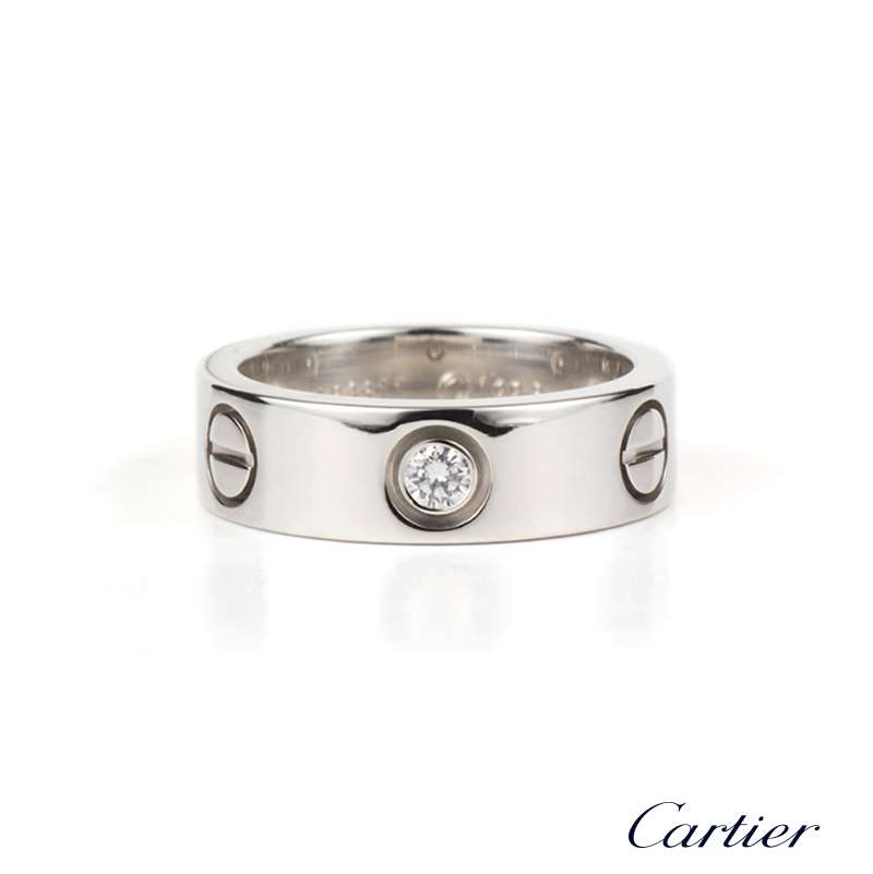 An iconic Cartier 18k white gold half diamond Love ring. The screw motif alternates with three round brilliant cut diamonds through the centre of the band. The ring is a size 60 and has a gross weight of 9.96 grams.