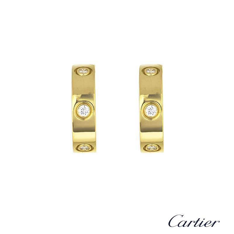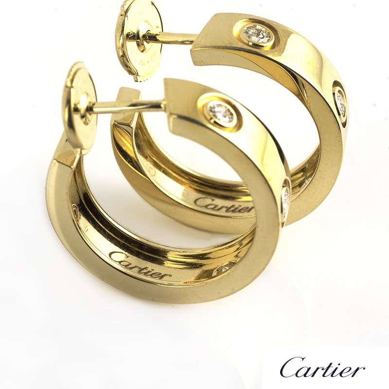Cartier 18k yellow gold and diamond earrings from the iconic Love collection. The hoop earrings are set with three round brilliant cut diamonds. The earrings are 2 cm in length and 0.5cm in width and come complete with original Cartier backs. The gross weight is 12.21 grams.