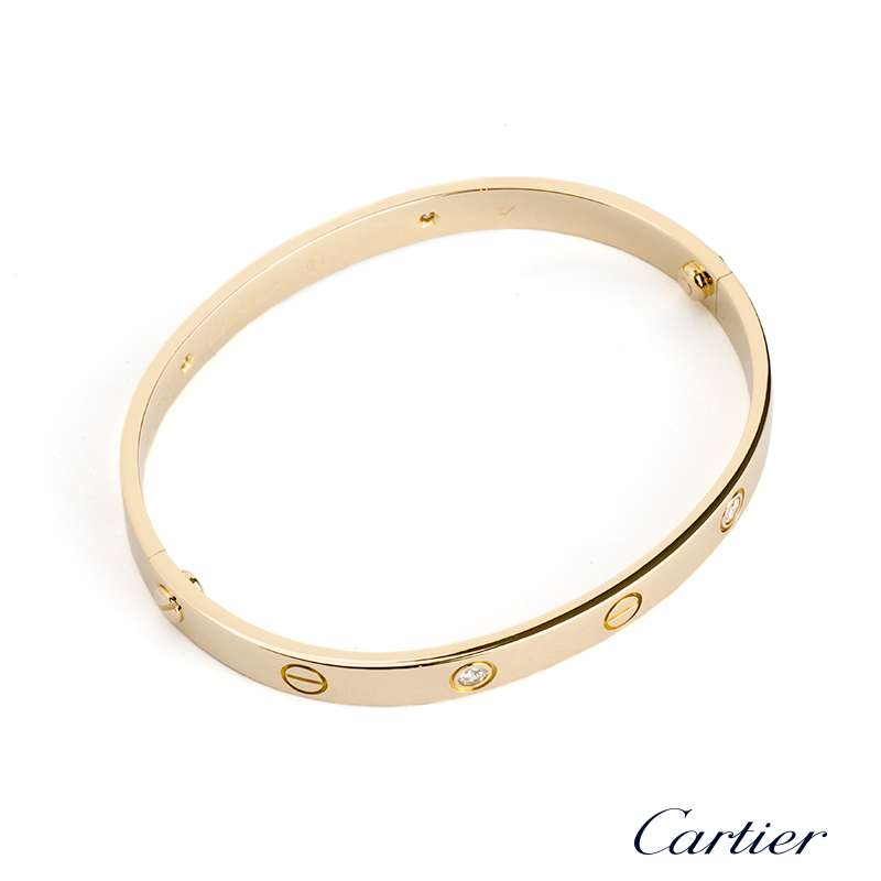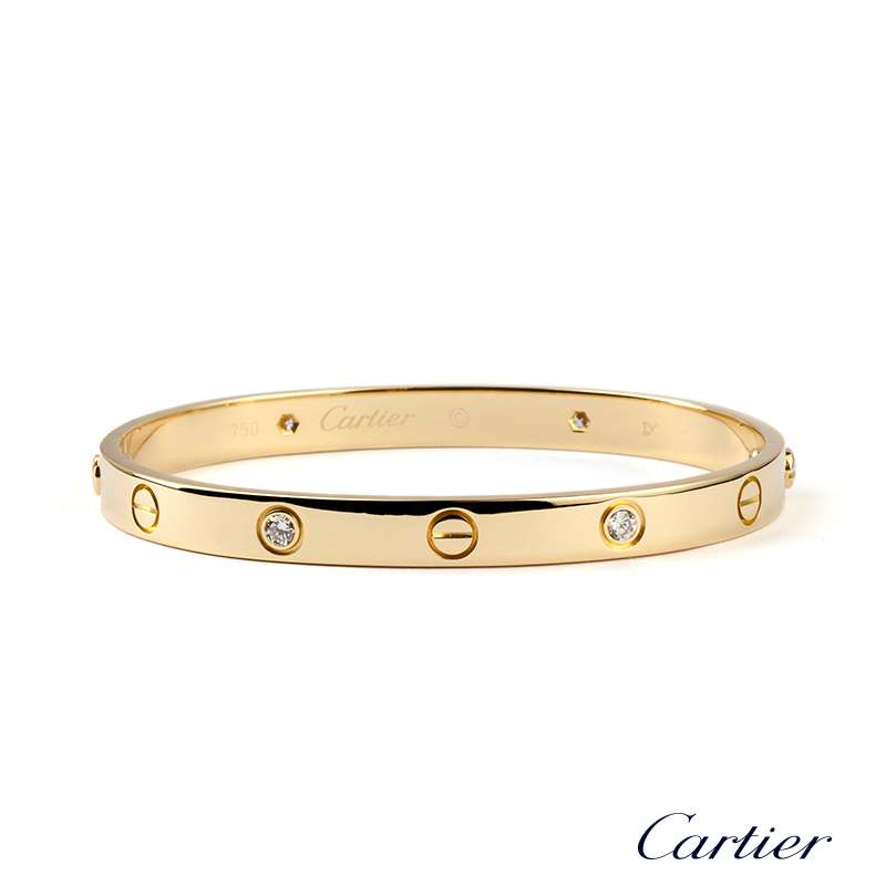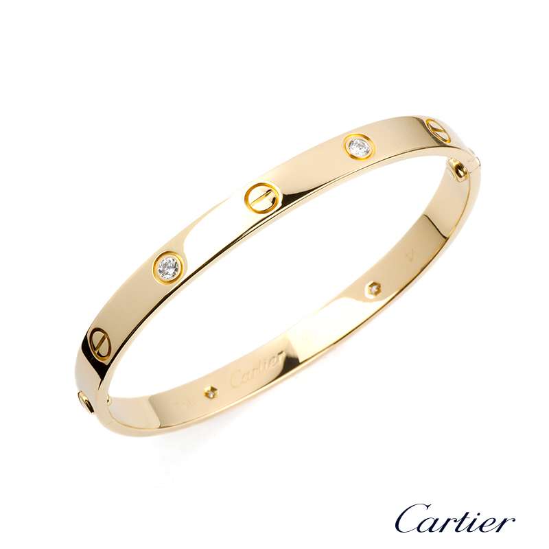 An iconic half diamond Cartier Love bangle in 18k yellow gold. The bangle is set with 4 round brilliant cut diamonds, alternating with the signature screw motif. The bangle is a size 18. Cartier model number B6035918. The gross weight is 34.28 grams.