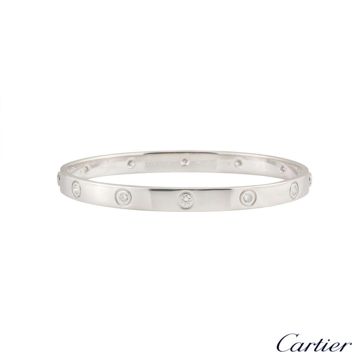 An iconic 18k white gold full diamond Cartier bracelet from the Love collection. The bracelet is set with 10 round brilliant cut diamonds circulating the outer edge throughout in a rubover setting. The bracelet is size 16 and features the old style screw fitting and has a gross weight of 29.2 grams.