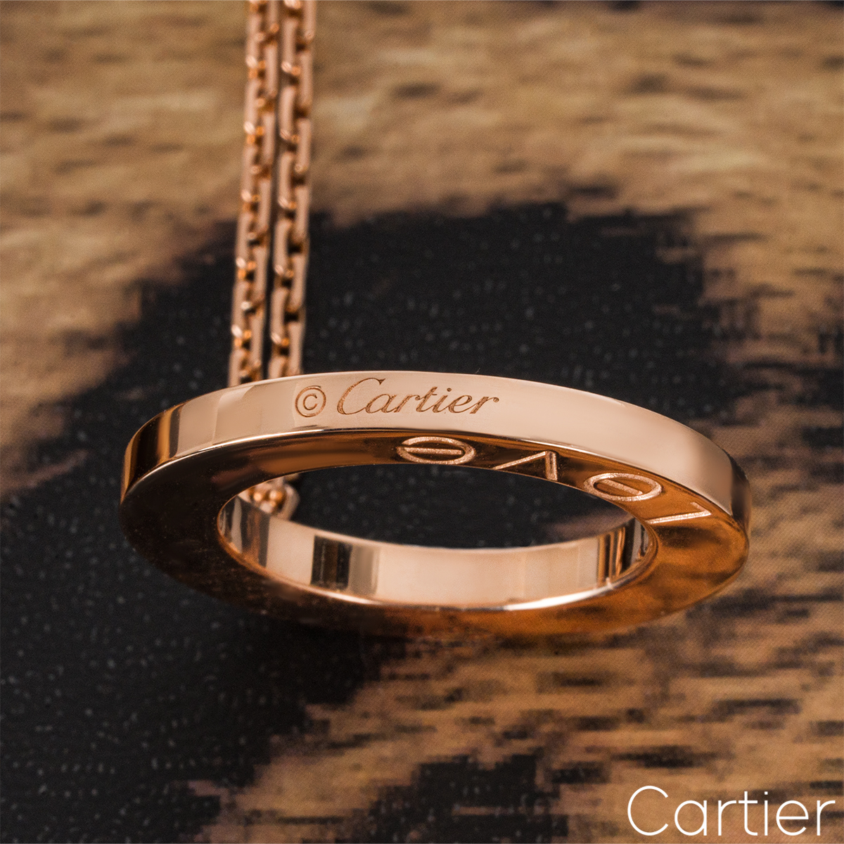 A beautiful 18k rose gold diamond pendant by Cartier from the Love collection. The pendant is composed of an open work circular motif, set to the outer edges with three round brilliant cut diamonds totalling 0.07ct and alternating between the iconic screw motifs. On the reverse of the pendant the word 'Love' is engraved to the bottom. The pendant measures 2.4cm in diameter, is suspended from a 16-inch chain that finishes with a lobster clasp fitting and has a gross weight of 12.84 grams.