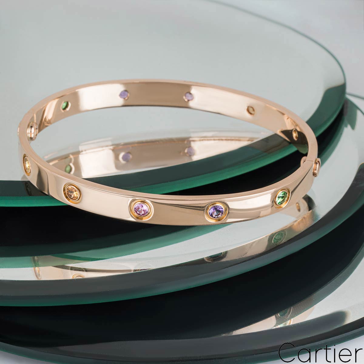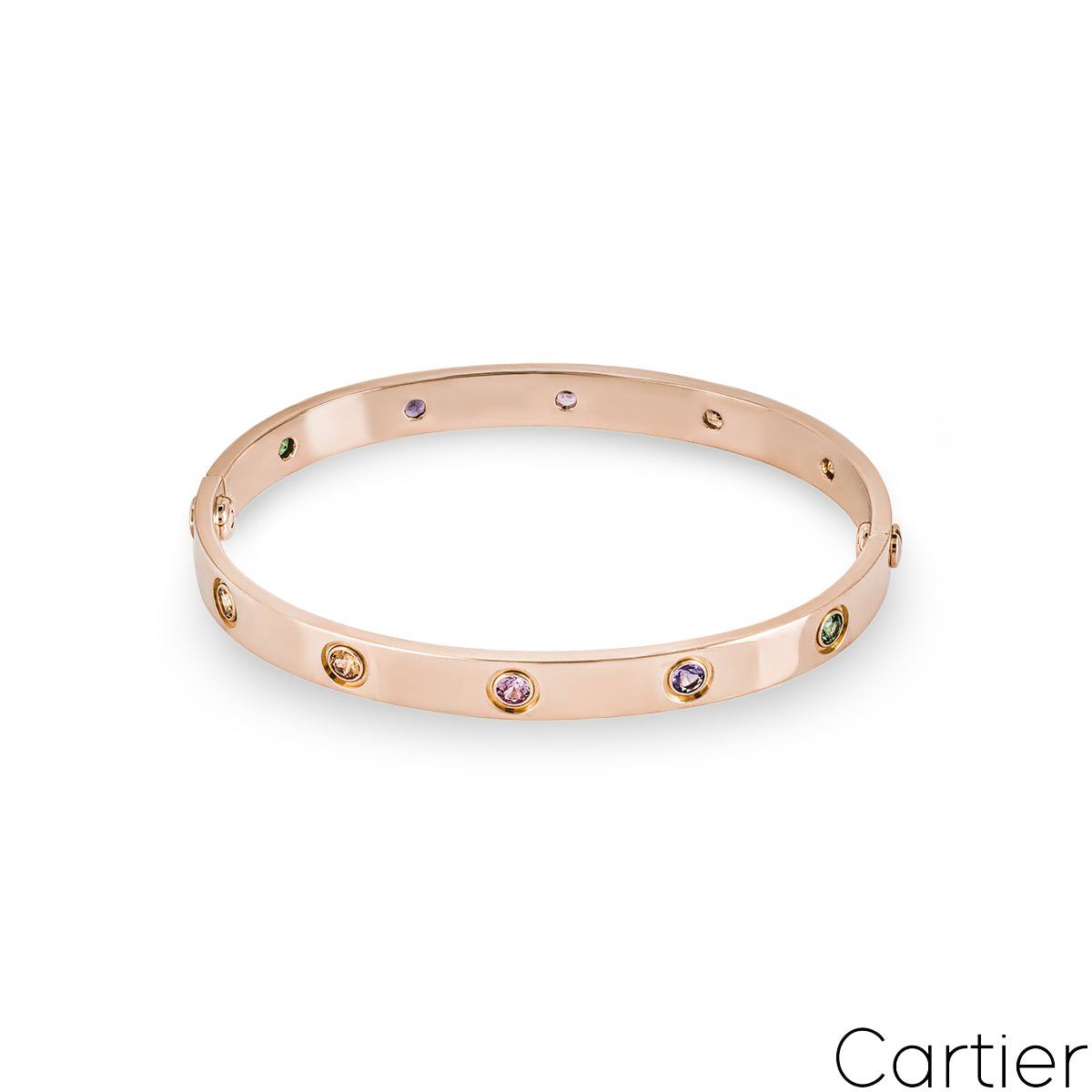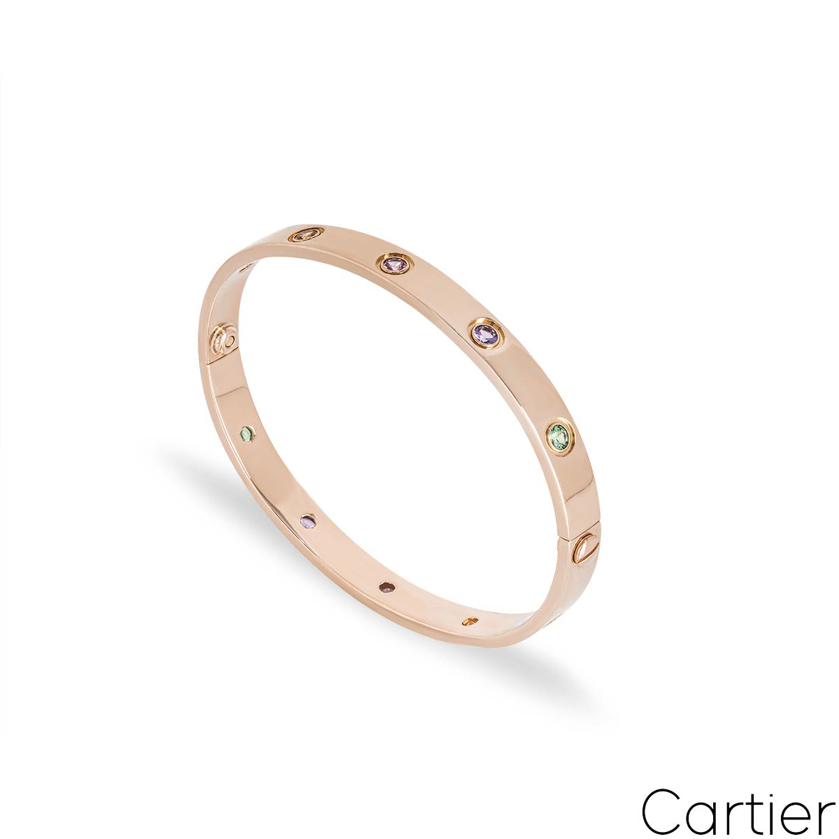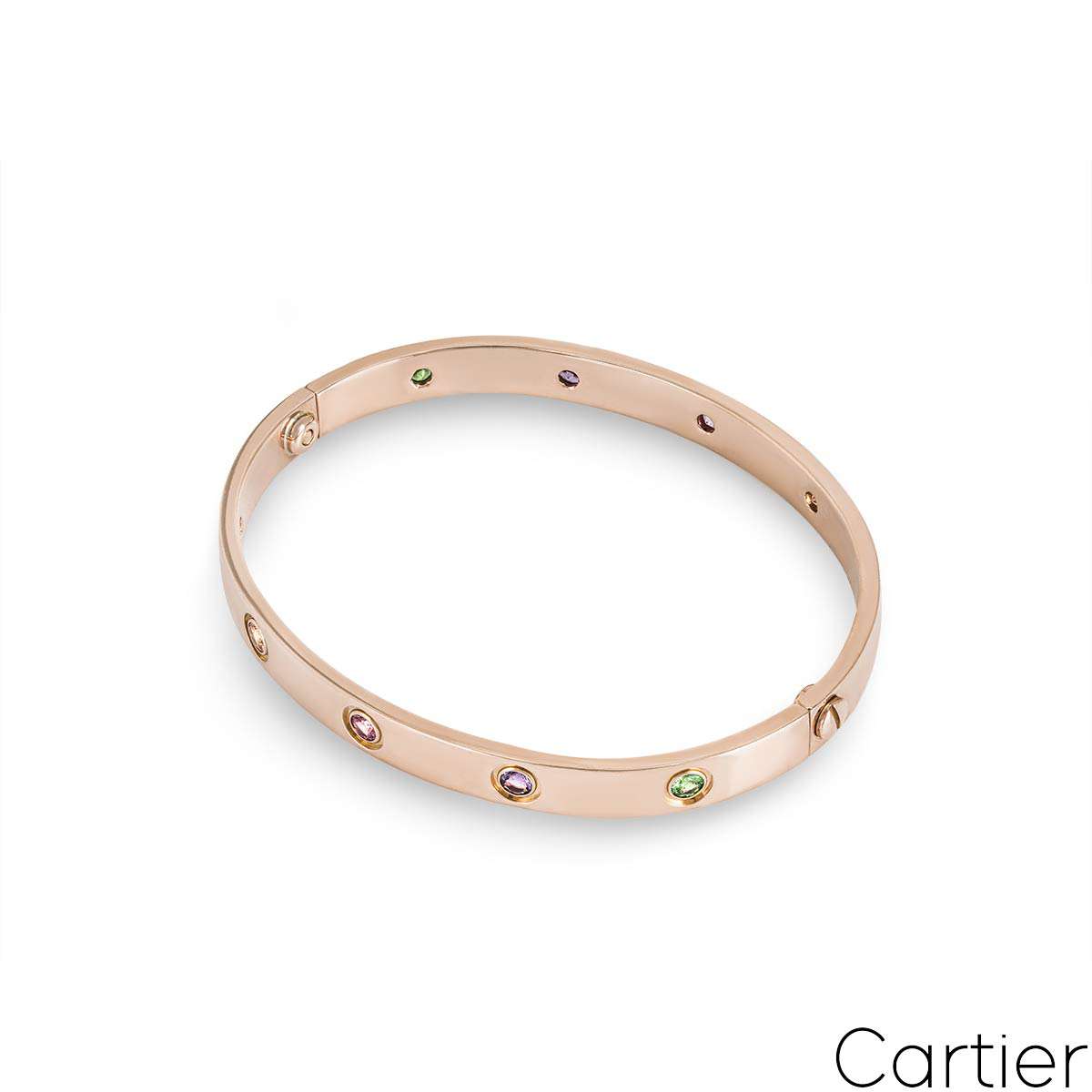 A colourful 18k rose gold coloured stones Cartier bracelet from the Love collection. The bracelet is set with 10 coloured stones throughout the centre, including amethyst, yellow sapphires, pink sapphires and green and orange garnets. The bracelet features the old style screw system and is a size 16 with a gross weight of 26.60 grams.
