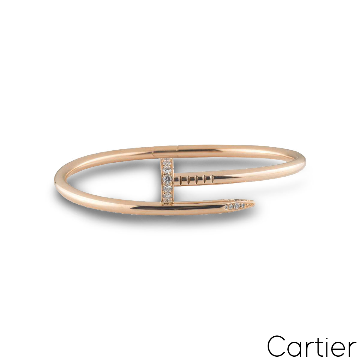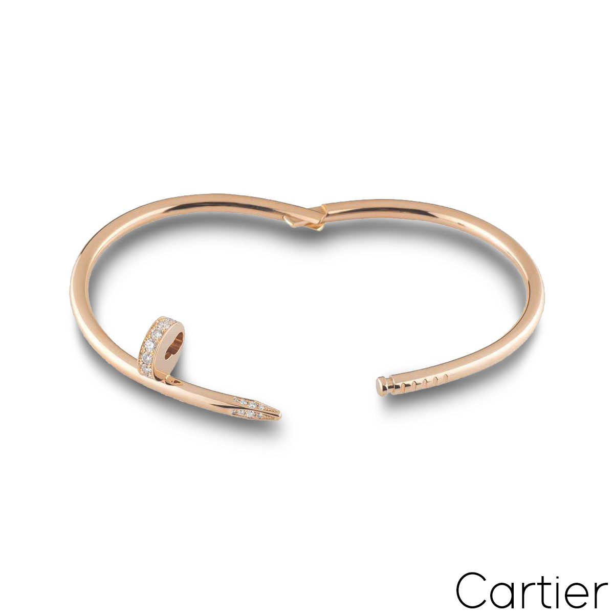An 18k rose gold Cartier diamond bracelet from the Juste Un Clou collection. The bracelet is in the style of a nail and has 27 round brilliant cut pave diamonds set in the head and tip, totalling 0.54ct. The diamonds are predominantly F colour and VS clarity. The bracelet is size 18 and features the old clasp fitting with a gross weight of 33.3 grams.