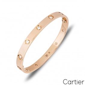 An iconic 18k rose gold full diamond Love bracelet by Cartier. The bracelet is set with 10 round brilliant cut diamonds circulating the outer edge throughout totalling 0.96ct. The bracelet is a size 17 and features the new style screw fitting and has a gross weight of 28.60 grams.