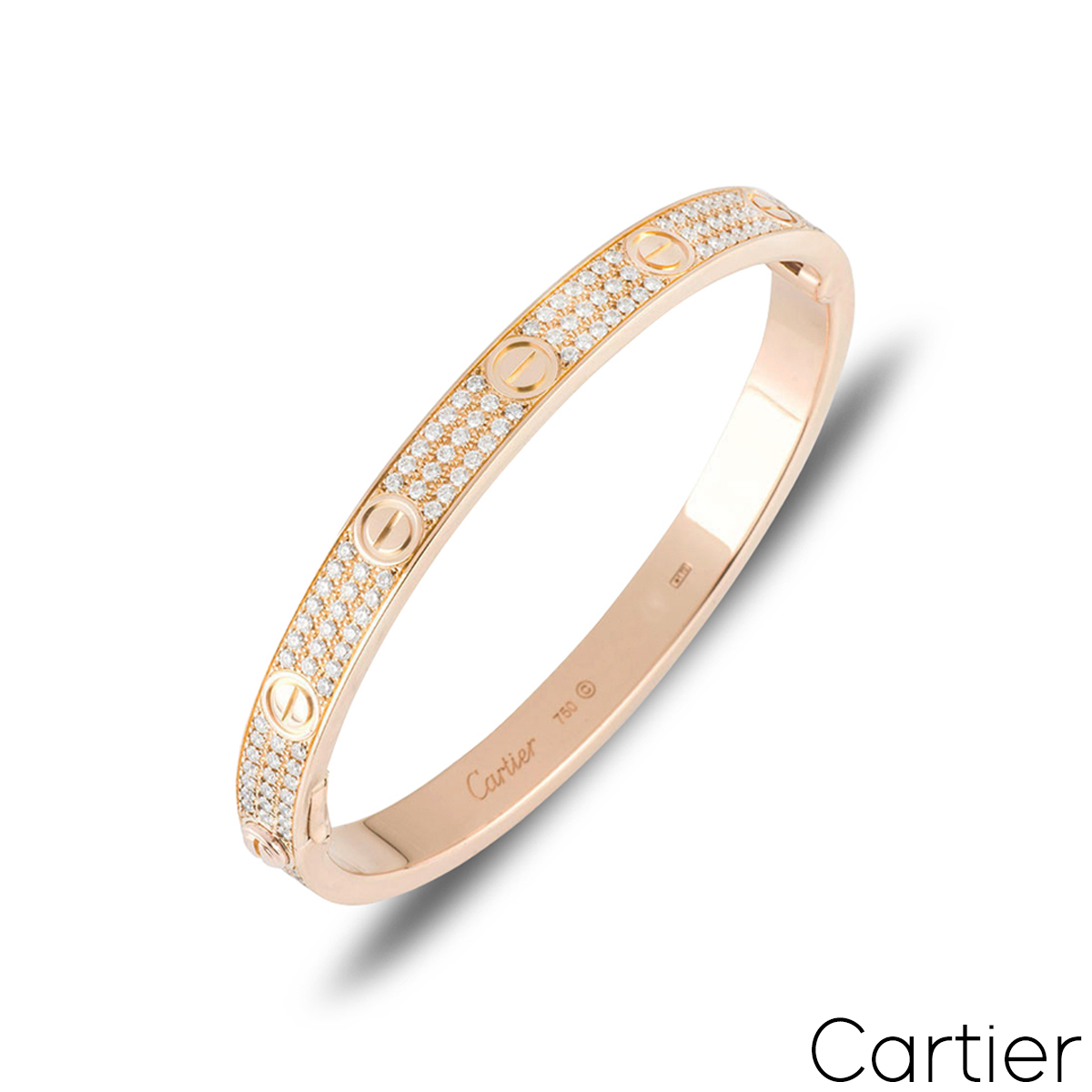 A sparkly 18k rose gold diamond Cartier bracelet from the Love collection. The bracelet comprises of the iconic screw motif on the outer edge complemented with 204 round brilliant cut diamonds throughout, in a pave setting. The diamonds have an approximate total weight of 2.00ct, F colour and VS+ clarity. The bracelet is size 18 and has a gross weight of 48.41 grams.