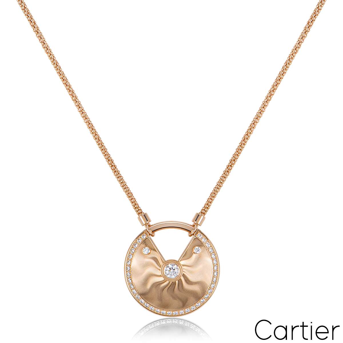 A rare18k rose gold large size necklace from the Amulette de Cartier collection. The necklace comprises of a circular talisman displaying a guilloche pattern, complemented by round brilliant cut diamonds totalling approximately 0.58ct. The talisman is on a 19 inch chain and has a gross weight of 32.2 grams.