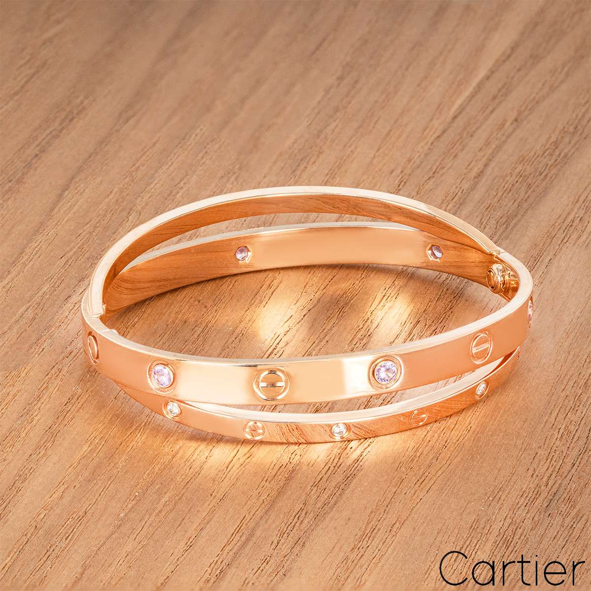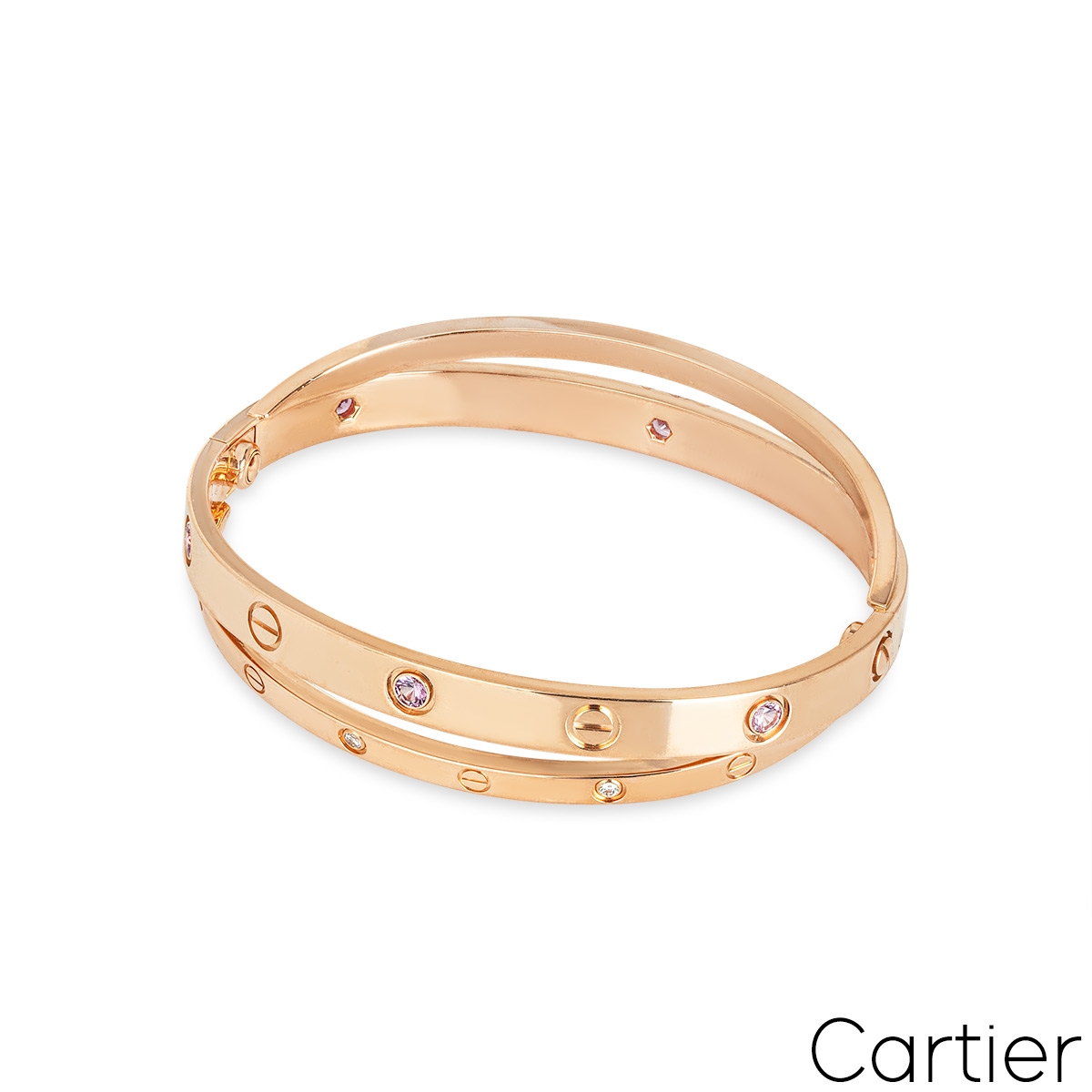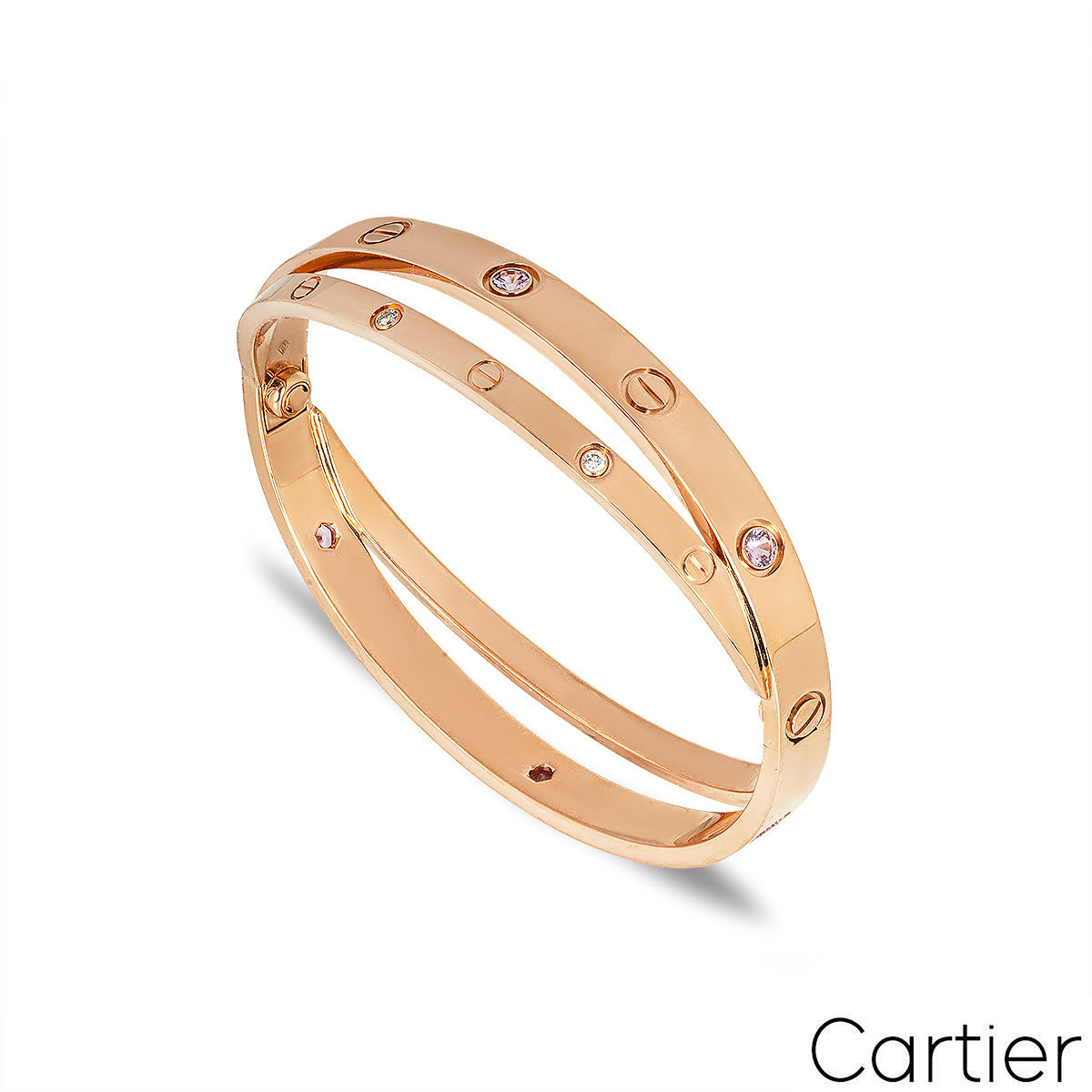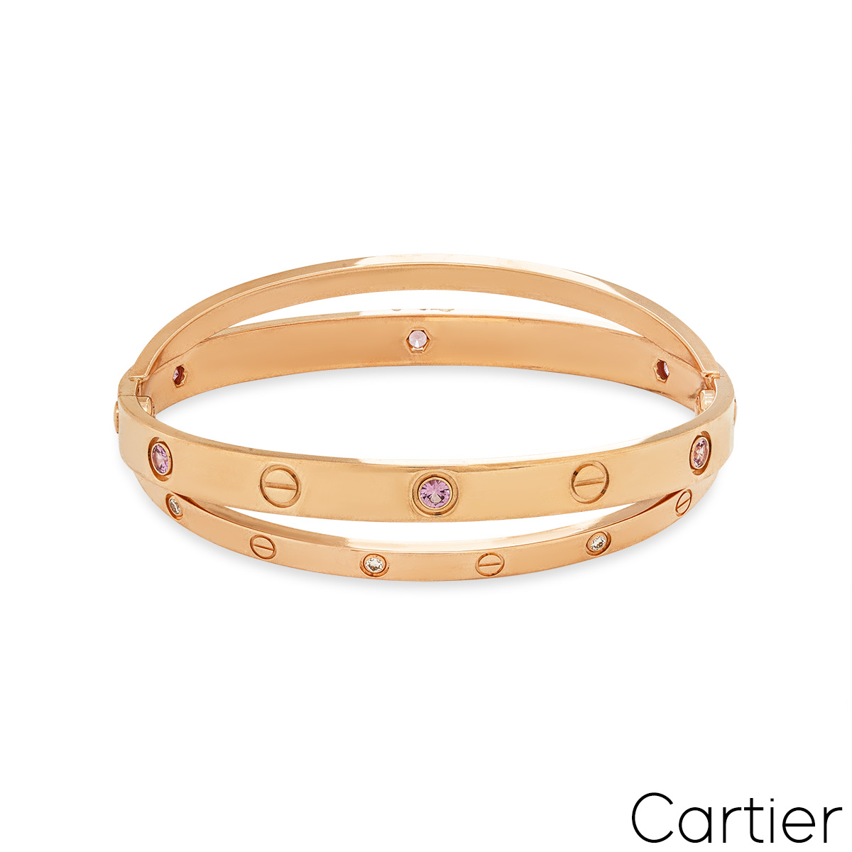 An iconic 18k rose gold half diamond and pink sapphire double Cartier bracelet from the Love collection. The double bangle features the iconic screw motif alternating with 6 round brilliant cut diamonds and 6 pink sapphires displayed around the outer edge. The bracelet is a size 17 and features the new style screw fitting with a gross weight of 47.6 grams.