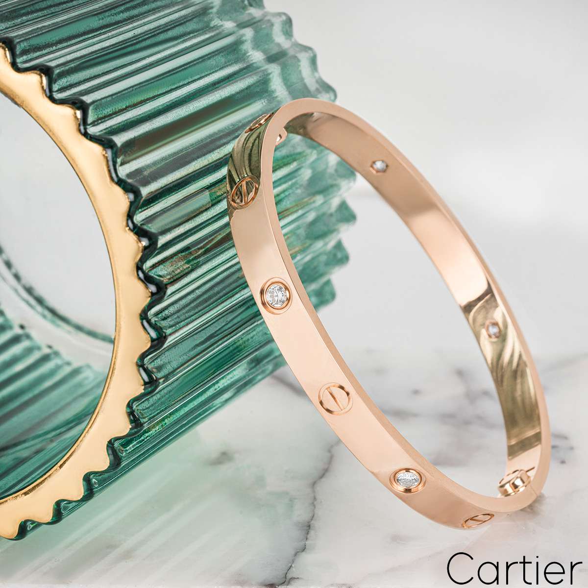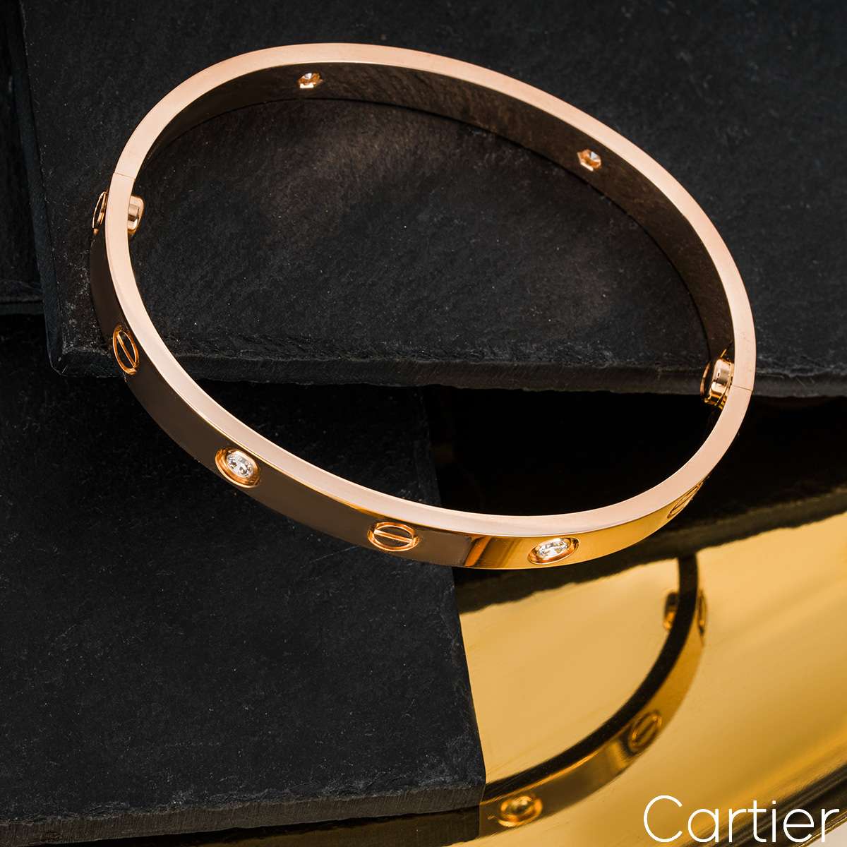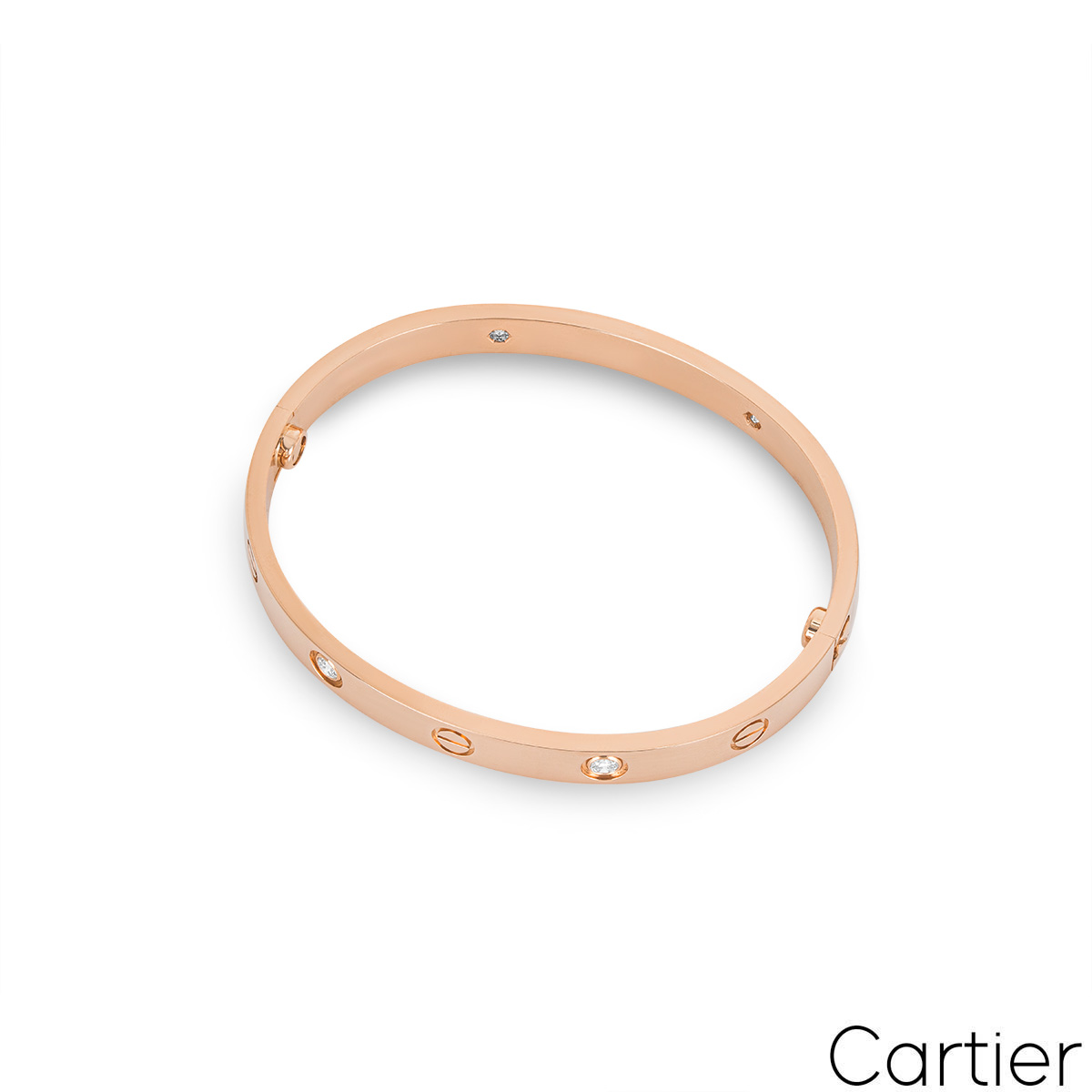 An 18k rose gold Cartier half diamond bracelet from the Love collection. The bracelet comprises of screw motifs alternating with four round brilliant cut diamonds in a rubover setting on the outer edge of the bracelet with a weight of 0.42ct. The bangle is a size 15 and features the new style screw system with a gross weight of 24.8 grams.