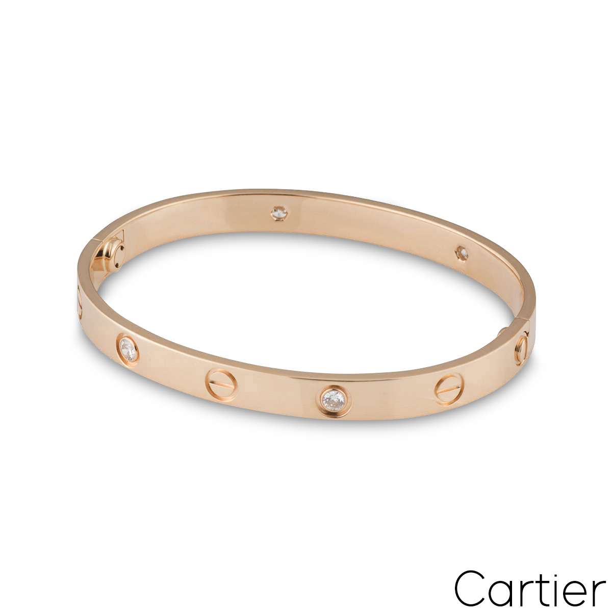 An 18k rose gold Cartier half diamond bracelet from the Love collection. The bracelet comprises of screw motifs alternating with four round brilliant cut diamonds in a rubover setting on the outer edge of the bracelet with a weight of 0.42ct. The bangle is a size 16 and features the new style screw system with a gross weight of 28.8 grams.