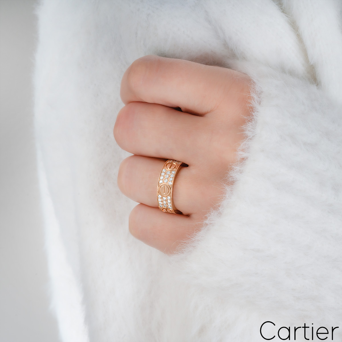 A stunning 18k rose gold diamond ring by Cartier from the Love collection. The ring comprises of the iconic screw motifs displayed around the outer edges with 66 round brilliant cut diamonds pave set between each screw motif with a total diamond weight of 0.70ct. The ring measures 6.5mm in width and is a size 53. The ring has a gross weight of 10.30 grams.