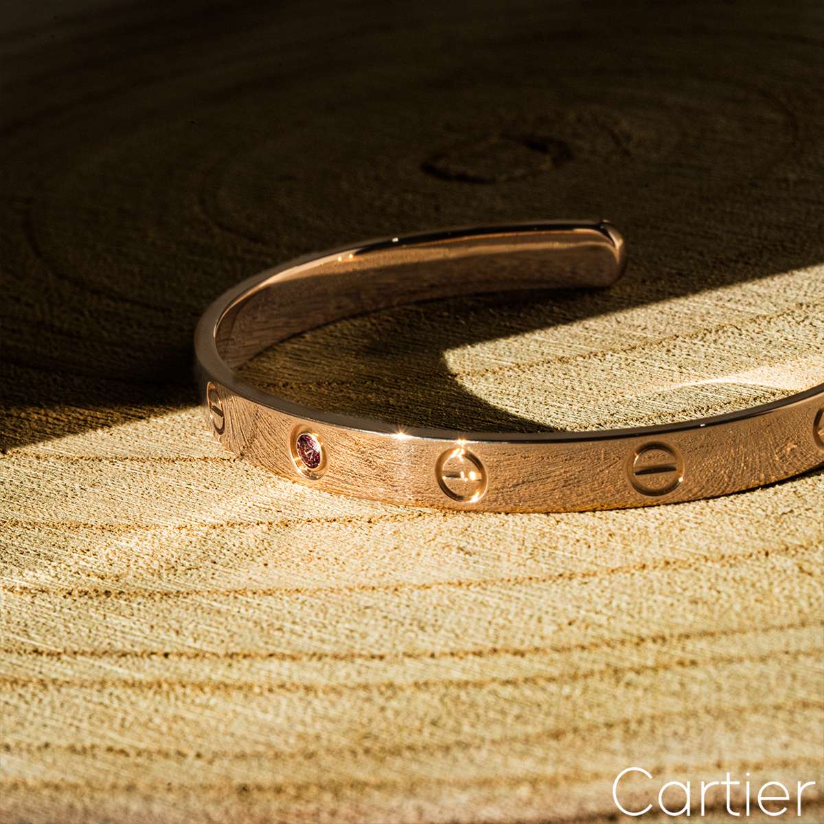 An 18k rose gold cuff bracelet by Cartier from the Love collection. This cuff bracelet has the iconic screw motif displayed throughout the outer edge with a single pink sapphire in the centre. The bracelet is a size 18 and has a gross weight of 23.50 grams.