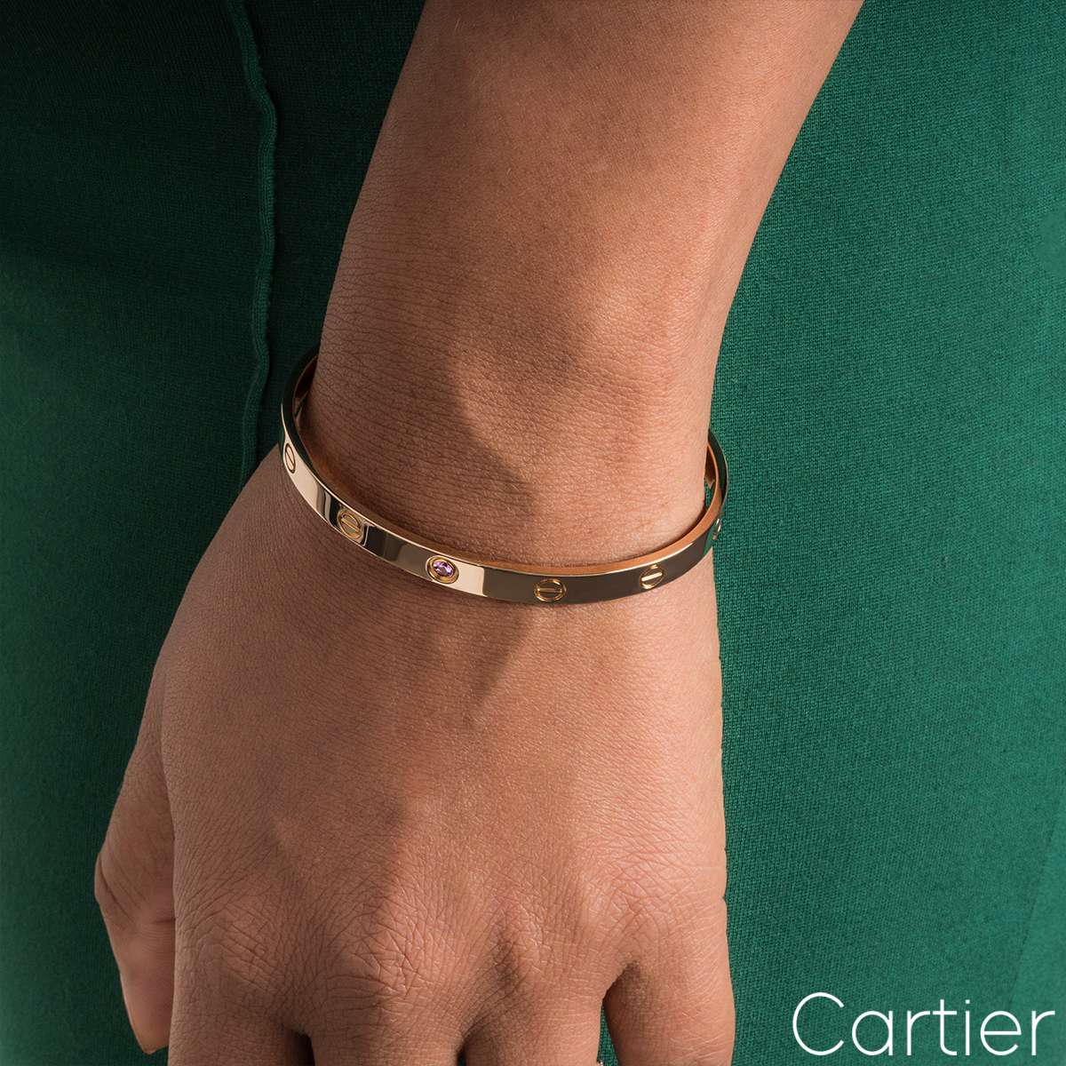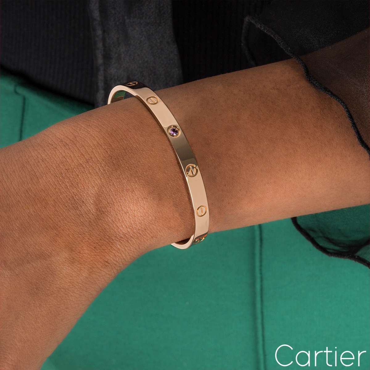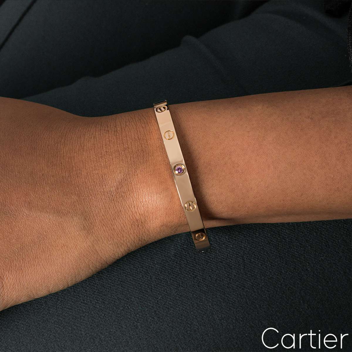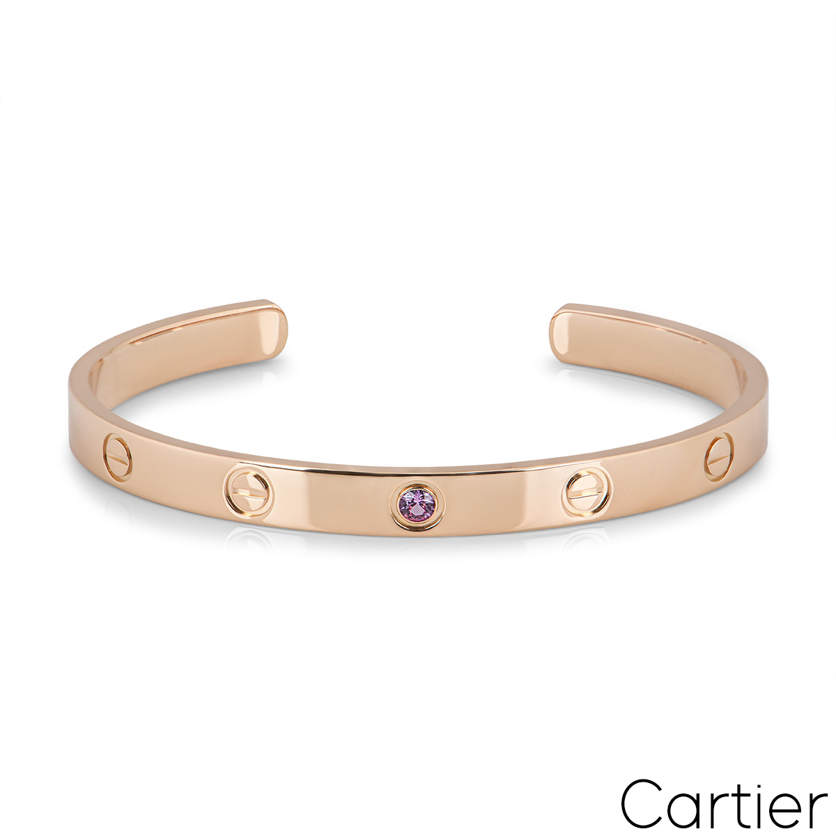 An 18k rose gold cuff bracelet by Cartier from the Love collection. This cuff bracelet has the iconic screw motif displayed throughout the outer edge with a single pink sapphire in the centre. The bracelet is a size 19 and has a gross weight of 26.50 grams.