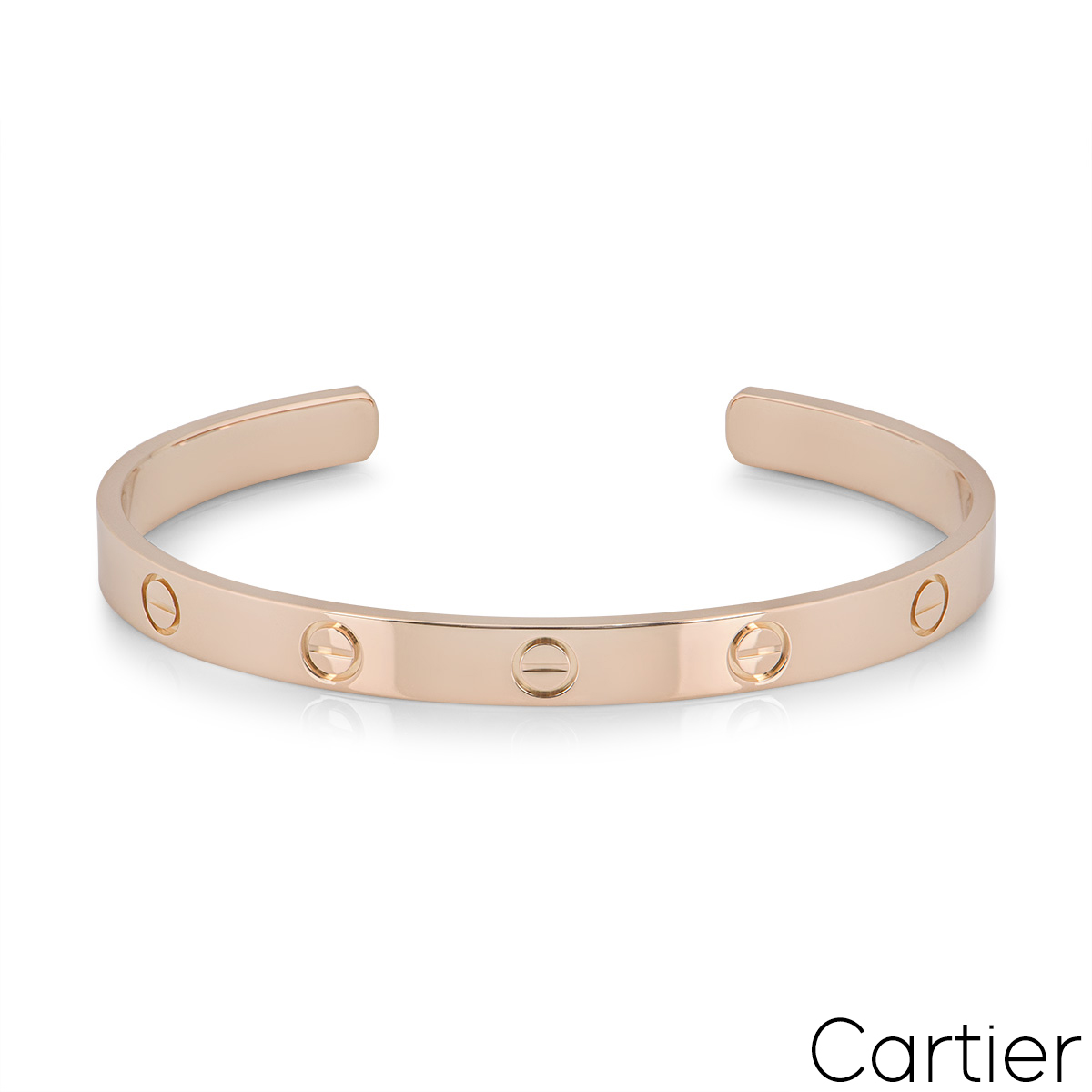 An iconic 18k rose gold Cartier bracelet from the Love collection. The bracelet comes in a cuff style and features the traditional screw motif design which is displayed around the outer edge of the bracelet. The bracelet is a size 18 and has a gross weight of 24.4 grams.