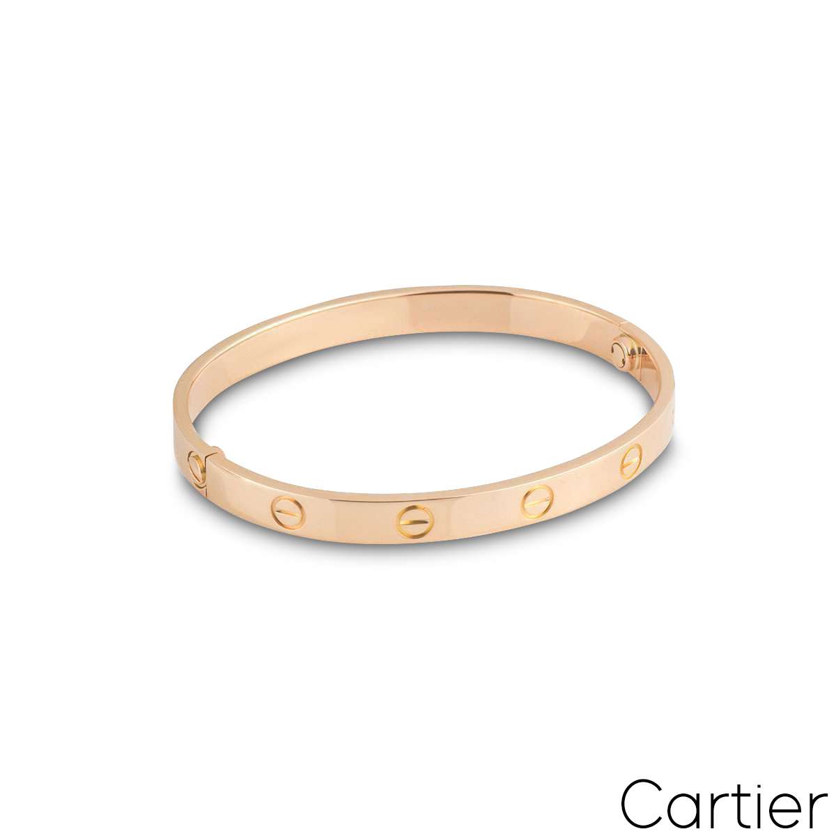 An 18k rose gold Cartier bracelet from the Love collection. The bracelet comprises of the iconic screw motifs around the outer edge. The bracelet is a size 15 and features the new style screw system with a gross weight of 26. grams.