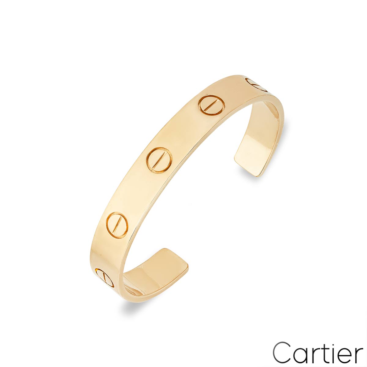 An 18k rose gold Cartier bracelet from their Love collection. The bracelet comprises of the iconic screw motif design around the outer edge. This bracelet is a size 20, features the service style screw system, and has a gross weight of 37.2 grams.