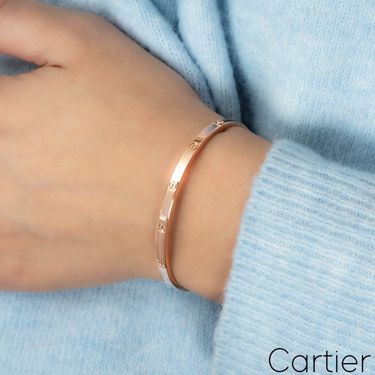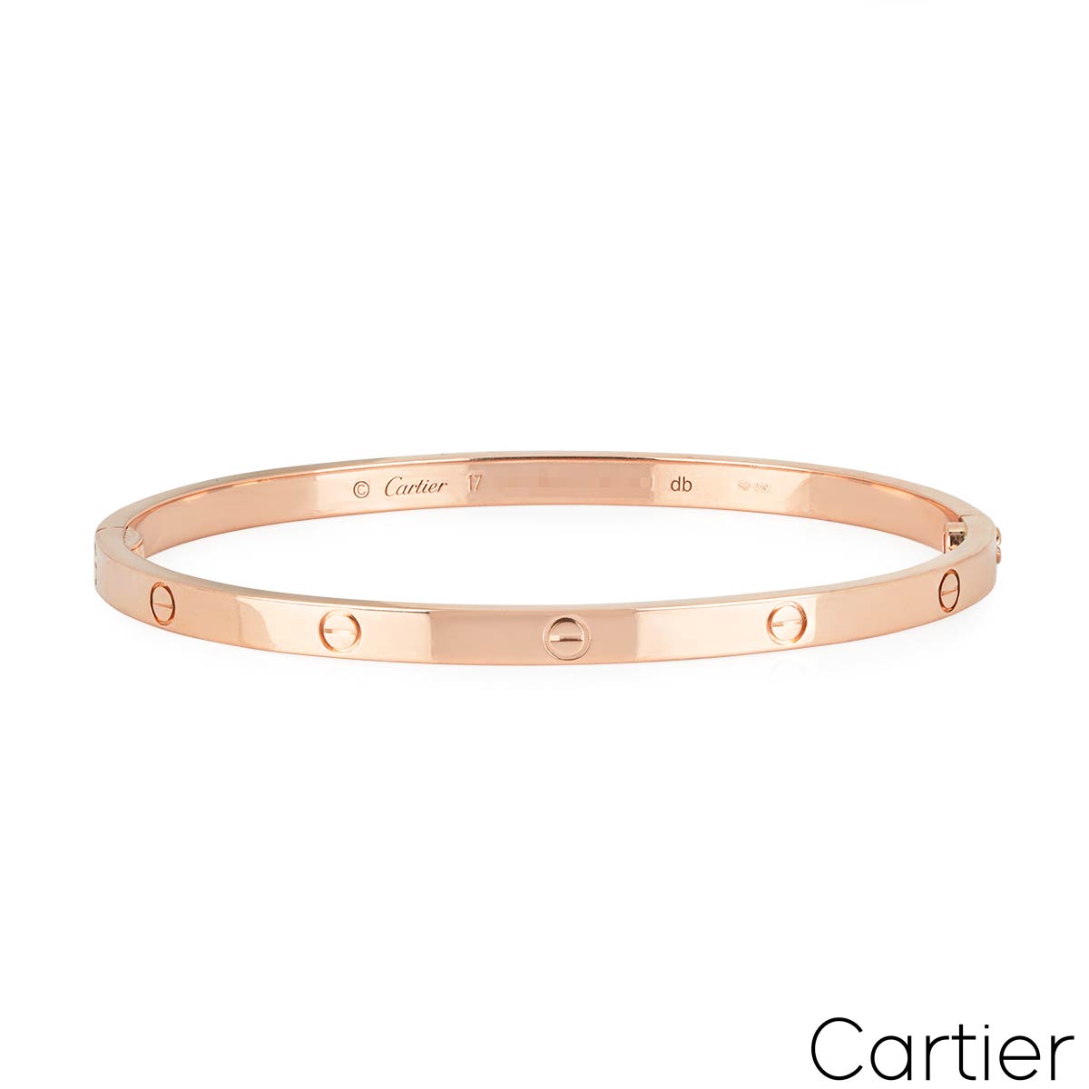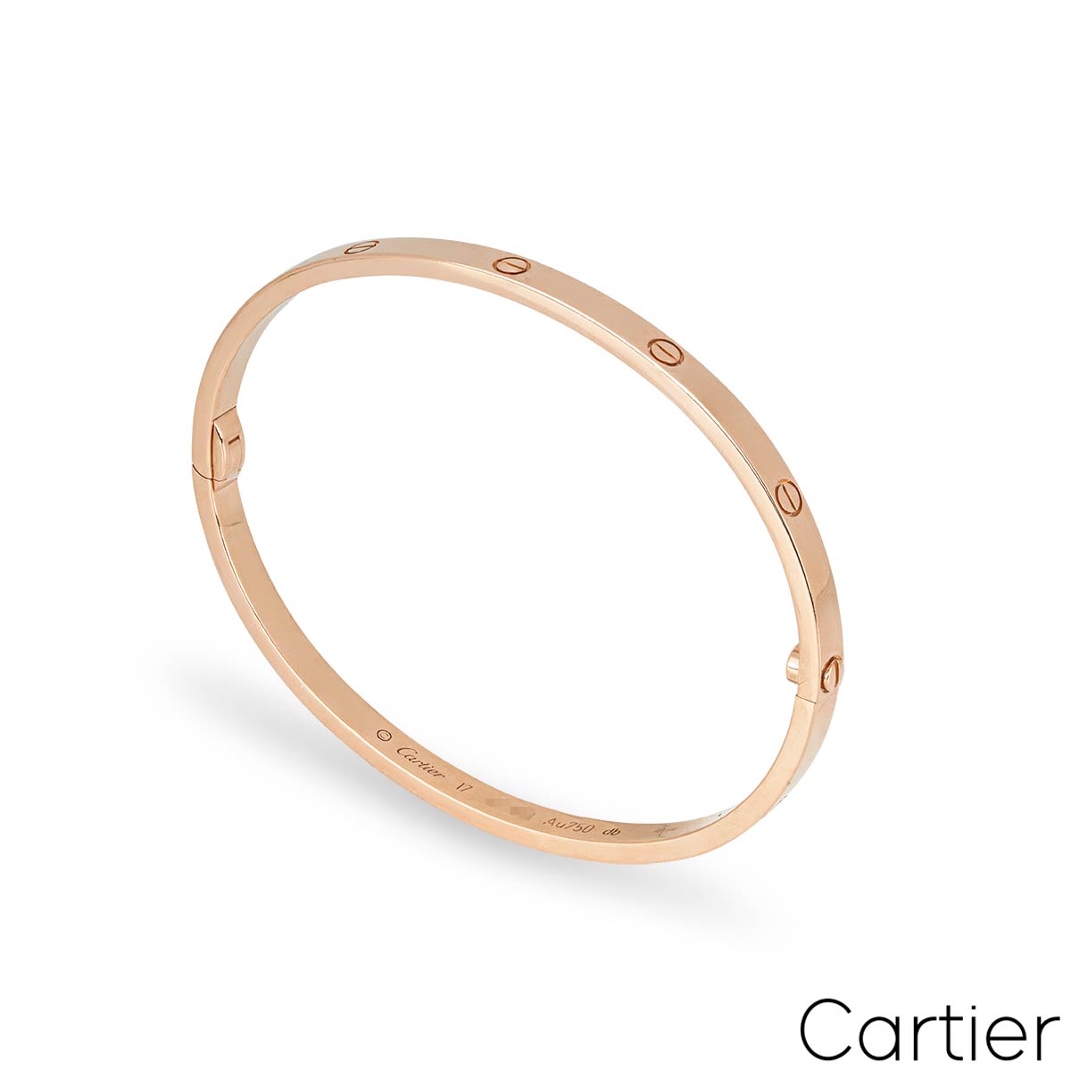 A Cartier bracelet in 18k rose gold, from their iconic Love collection. This smaller model (SM) of the classic Love bracelet features the Cartier screw motif design and a single screw and hinge fitting. The bracelet is a size 19 and has a gross weight of 21.2 grams.