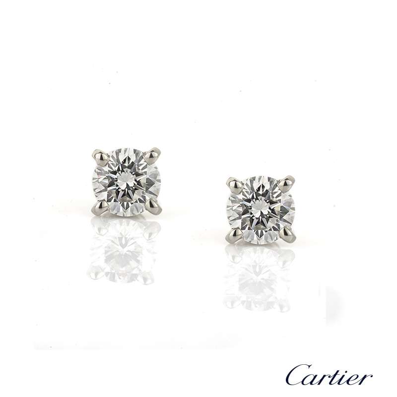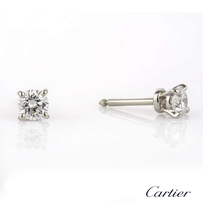 A pair of round brilliant cut diamond studs in platinum by Cartier. Each round brilliant cut diamond is set within a classic 4 claw setting, weighing 0.26ct, colour E and VS2 clarity. The earstuds have original Cartier post and backs and have a gross weight of 2.18 grams.