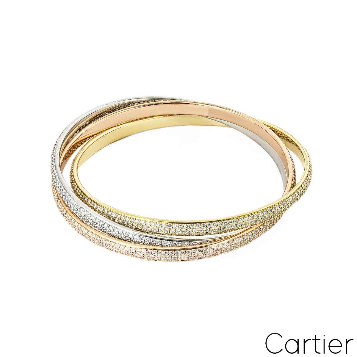 A 18k tri-colour Cartier bracelet from the Trinity collection. The design features three intertwined 18k white, rose, and yellow gold 5mm bands, each fully pavé-set with three rows of round brilliant-cut diamonds, giving a total estimated diamond weight of approximately 12.55 carats.