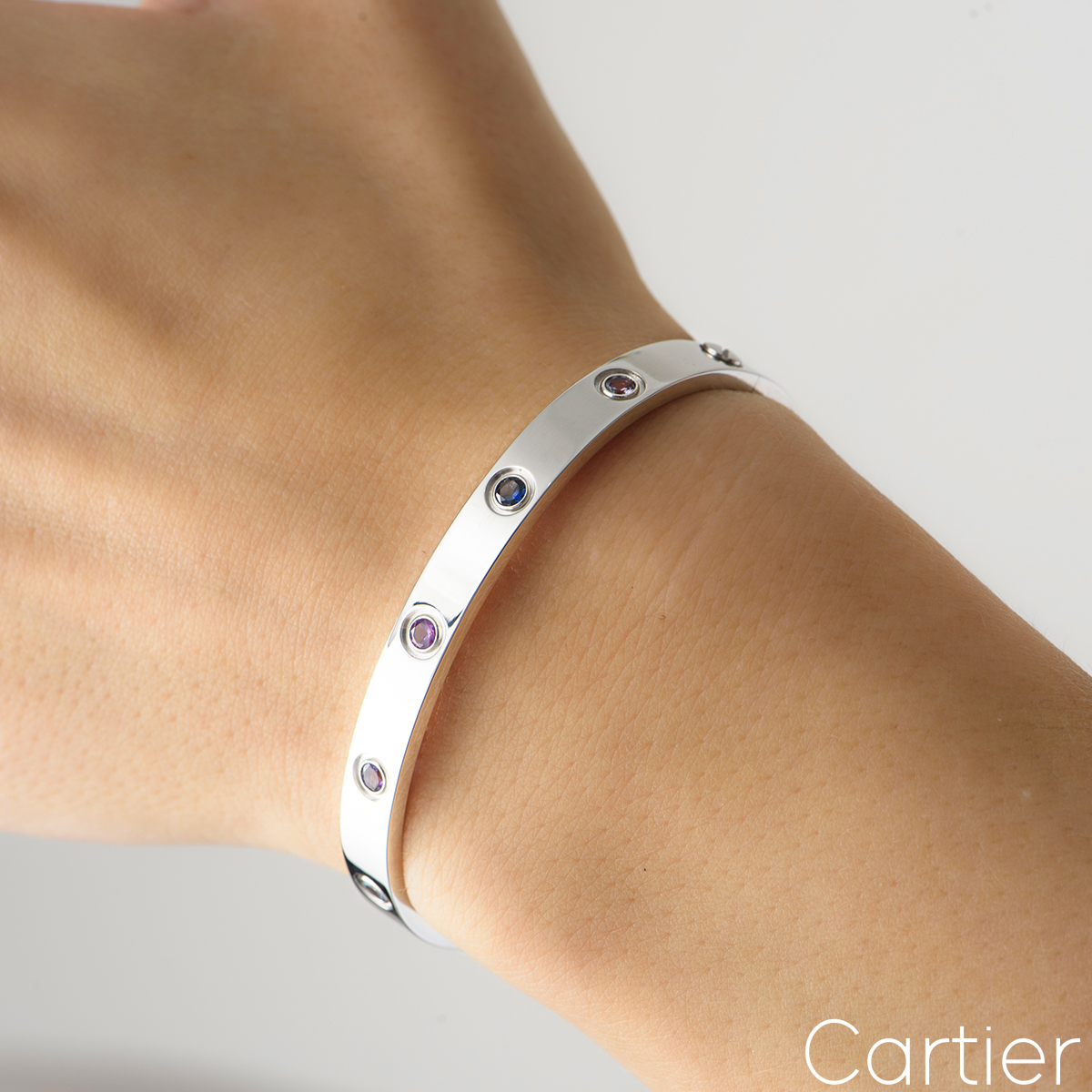 An iconic 18k white gold coloured stones Cartier bracelet from the Love collection. The bracelet is set with 10 coloured stones throughout the centre, including purple spinel, blue and pink sapphires, amethyst and aquamarine. The bangle has the old style screw system and is a size 17, with a gross weight of 30.5 grams.