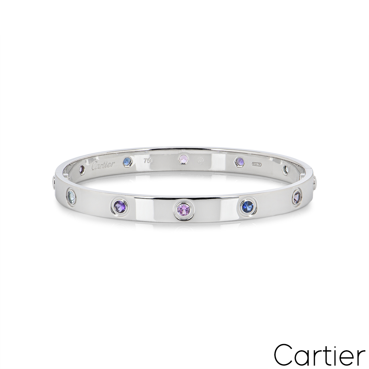 An 18k white gold coloured stones Cartier bracelet from the Love collection. The bracelet is set with 10 coloured stones throughout the centre, including purple spinel, blue and pink sapphires, amethyst and aquamarine. The bangle has the new style screw system and is a size 18, with a gross weight of 31.20 grams.