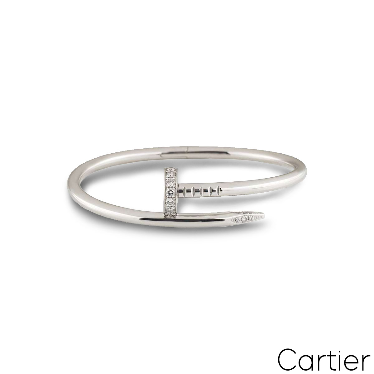 An iconic 18k white gold Cartier diamond bracelet from the Juste Un Clou collection. The bracelet is in the style of a nail and has 27 round brilliant cut pave diamonds set in the head and tip, totalling 0.54ct. The diamonds are predominantly F colour and VS clarity. The bangle features the old style clasp and is size 17 with a gross weight of 33.7 grams.