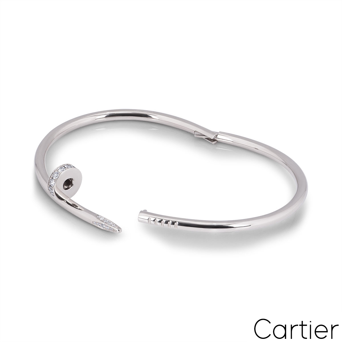 A signature 18k white gold Cartier diamond bracelet from the Juste Un Clou collection. The bracelet is in the style of a nail and has 32 round brilliant cut pave diamonds set in the head and tip, totalling 0.58ct. The diamonds are predominantly F colour and VS clarity. The bangle features the new style clasp and is size 17 with a gross weight of 33.6 grams.