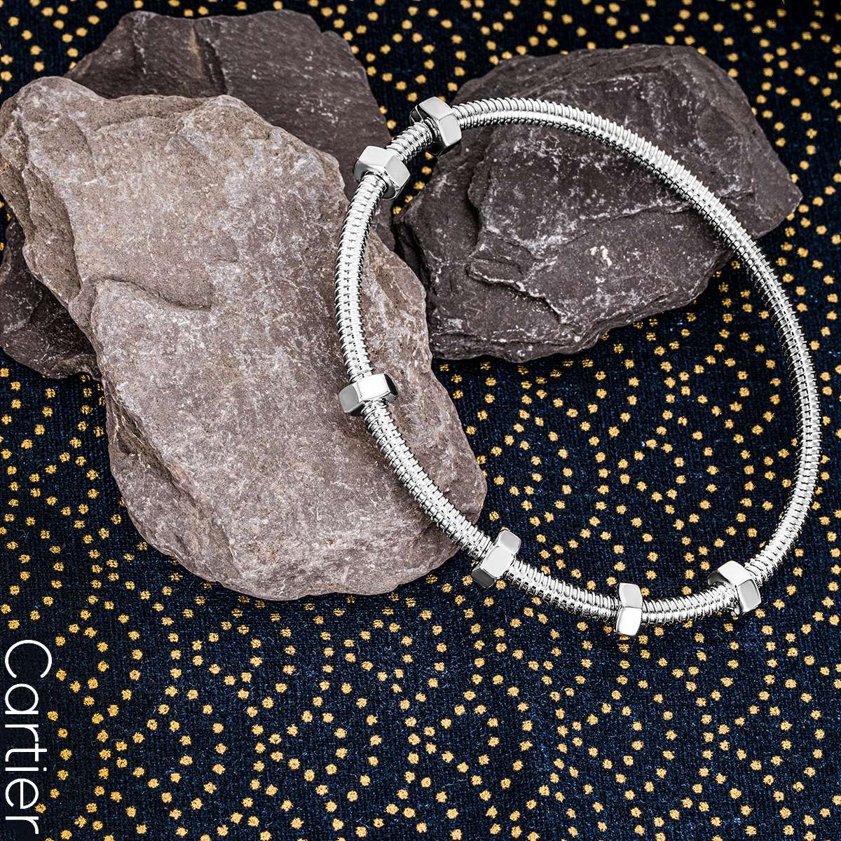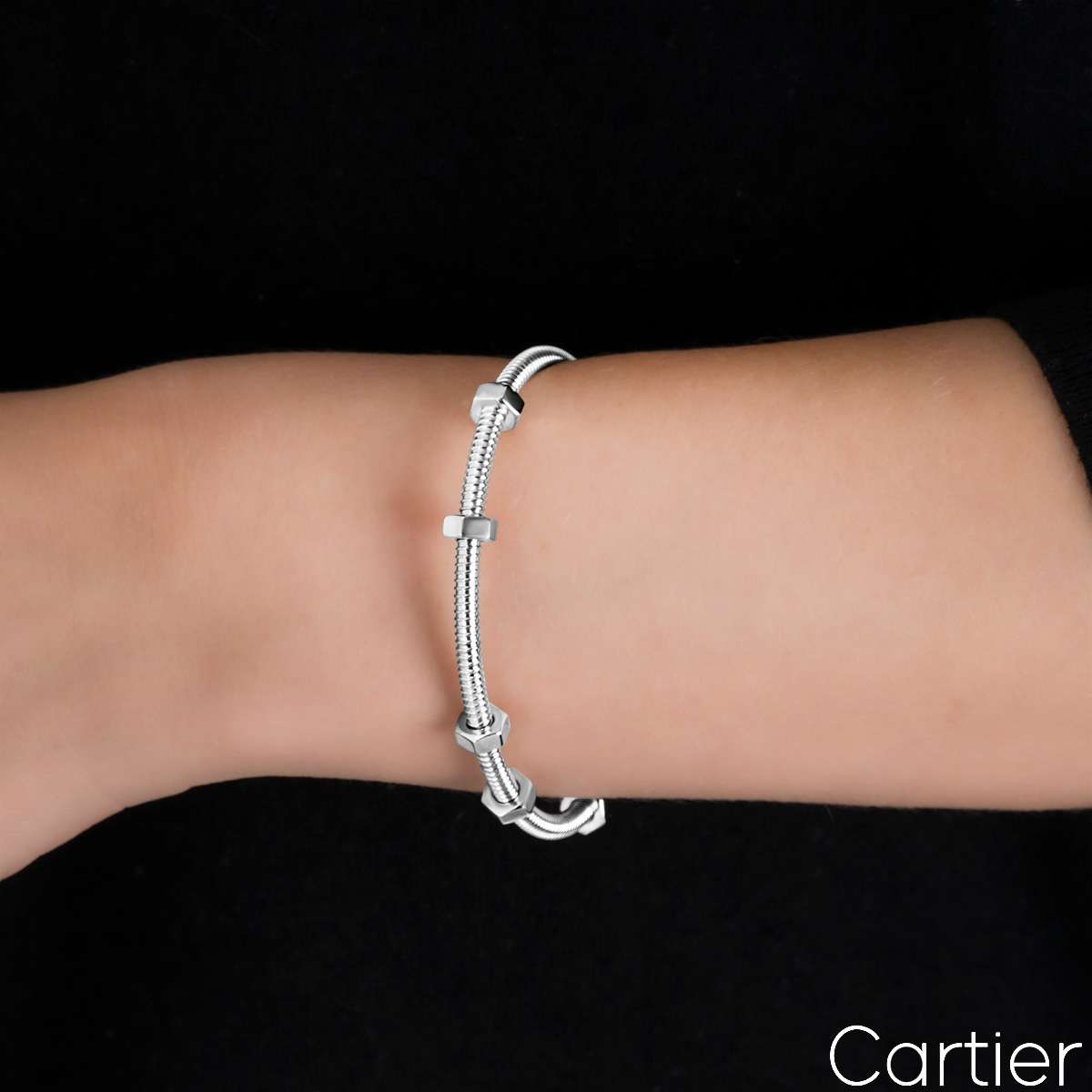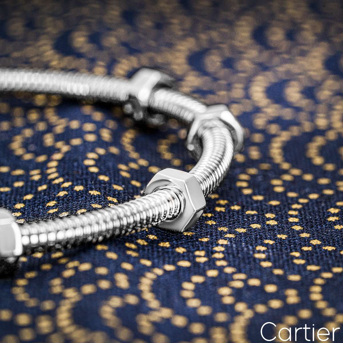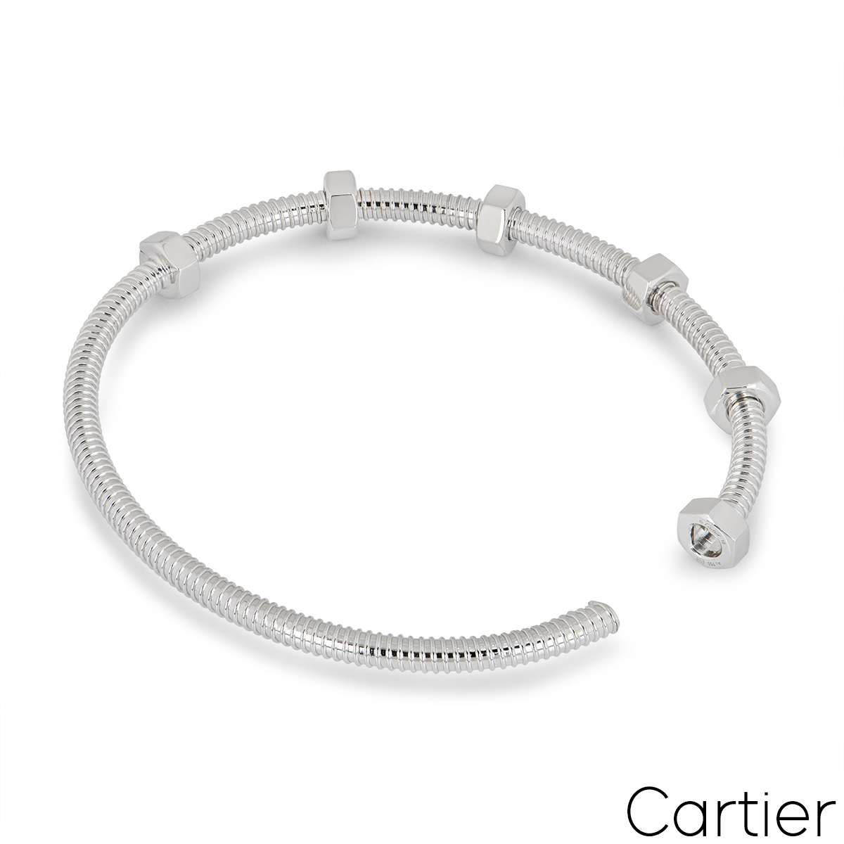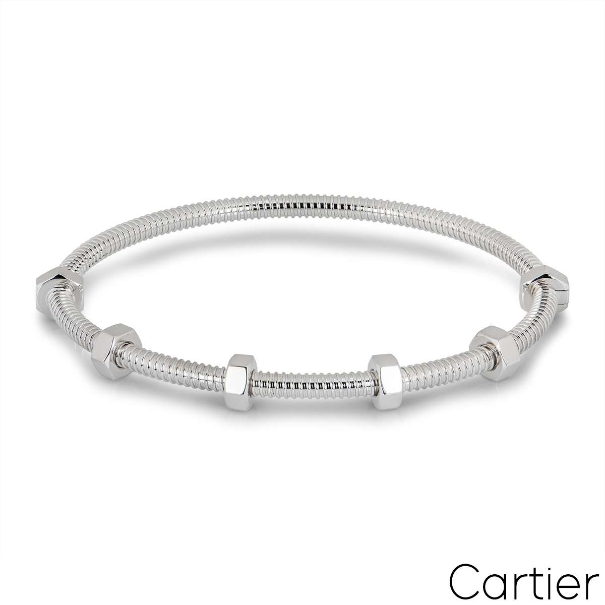 A stunning 18k White gold bracelet by Cartier from the Ecrou De collection. The bracelet has a threaded design which features 6 bolts with 4 swivelling freely along one side of the bracelet. The bracelet is a size 20 and has a gross weight of 33.7 grams.
