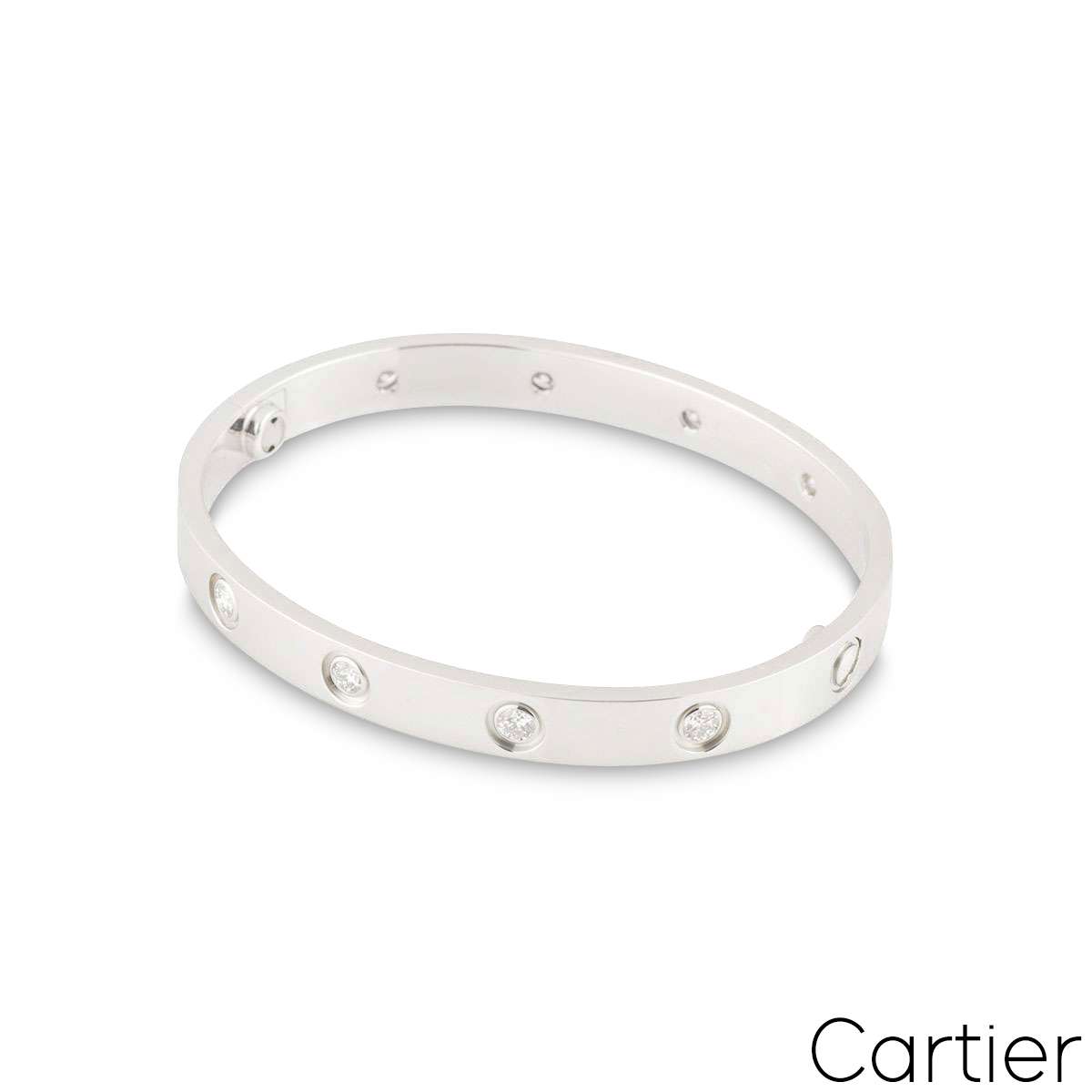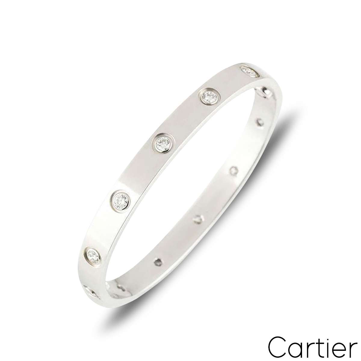 An iconic 18k white gold full diamond Cartier bracelet from the Love collection. The bracelet is set with 10 round brilliant cut diamonds circulating the outer edge throughout in a rubover setting. This bracelet is size 18 featuring the new style screw fitting and has a gross weight of 33.3 grams.