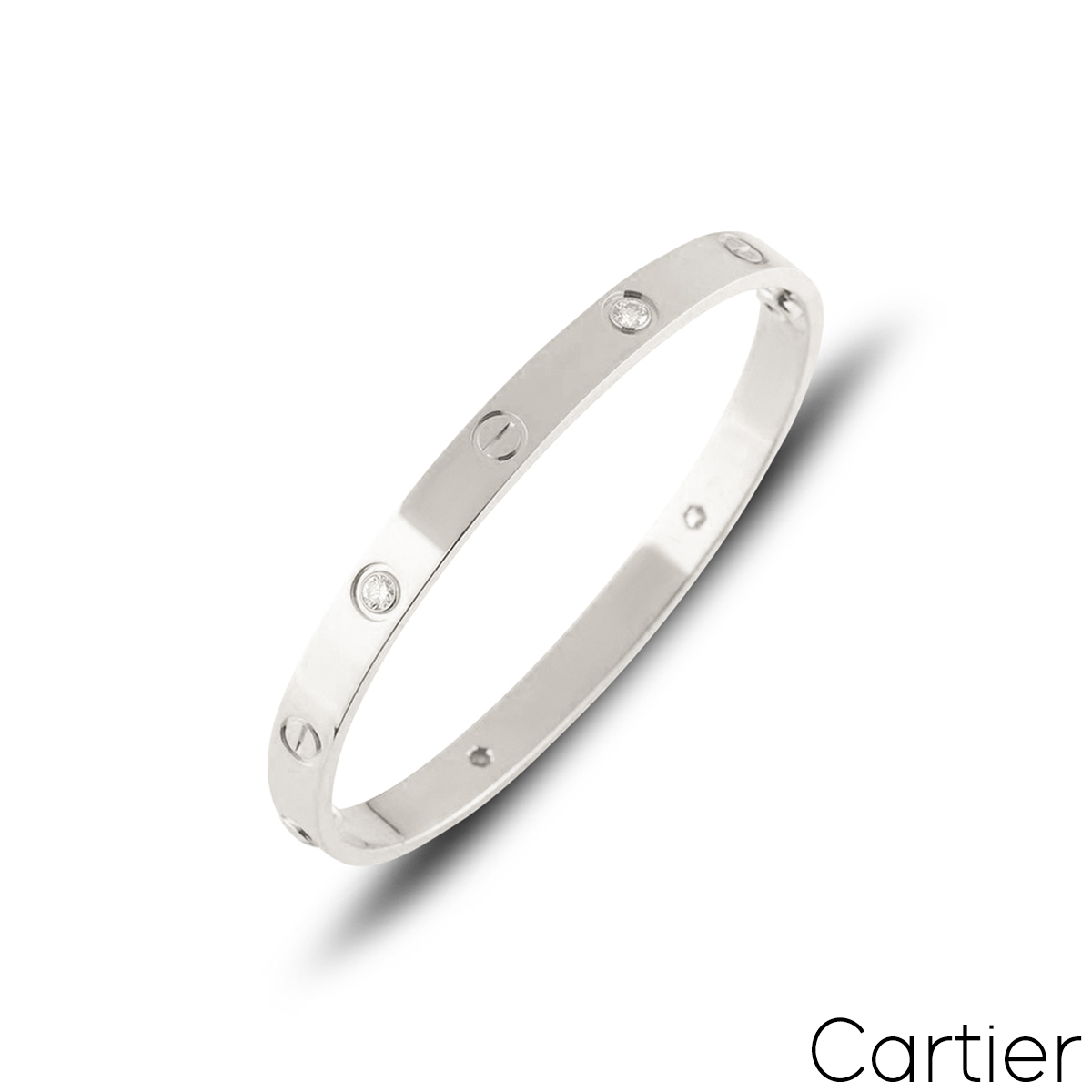 An 18k white gold Cartier half diamond bracelet from the Love collection. The bracelet comprises of the iconic screw motifs on the outer edge alternating with 4 round brilliant cut diamonds with a total weight of 0.42ct. The bracelet is a size 17 and features the old style screw system. The bracelet has a gross weight of 31.4 grams.