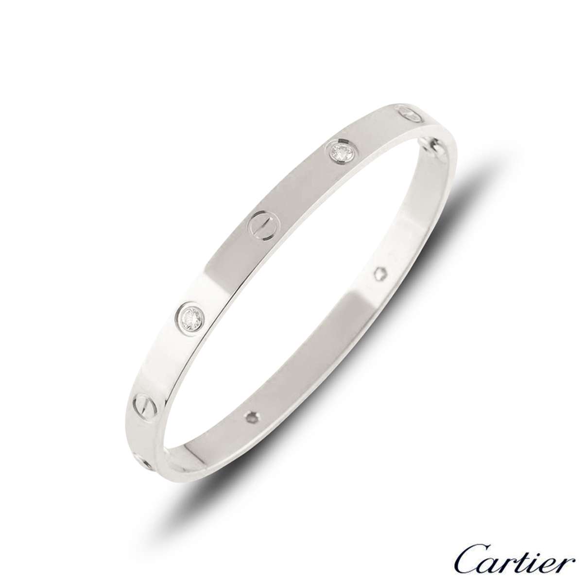 An iconic 18k white gold Cartier half diamond bracelet from the Love collection. The bracelet comprises of the iconic screw motifs on the outer edge alternating with 4 round brilliant cut diamonds with a total weight of 0.42ct. The bracelet is a size 18 and features the old style screw system. The bracelet has a gross weight of 33.20 grams.