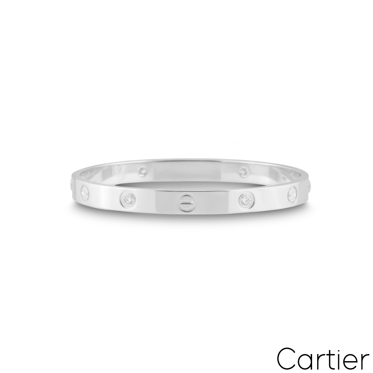 An 18k white gold Cartier half diamond bracelet from the Love collection. The bracelet comprises of the iconic screw motifs on the outer edge alternating with 4 round brilliant cut diamonds with a total weight of 0.42ct. The bracelet is a size 18 and features the new style screw system. The bracelet has a gross weight of 33.5 grams.
