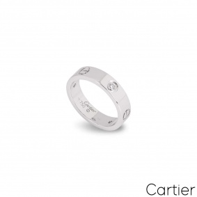 A signature 18k white gold ring from the Love collection by Cartier. Set with 3 round brilliant cut diamonds totalling 0.22ct, alternating between the iconic Cartier screw motifs. 5.5mm wide, the ring is a size 52 and has a gross weight of 8.86 grams.