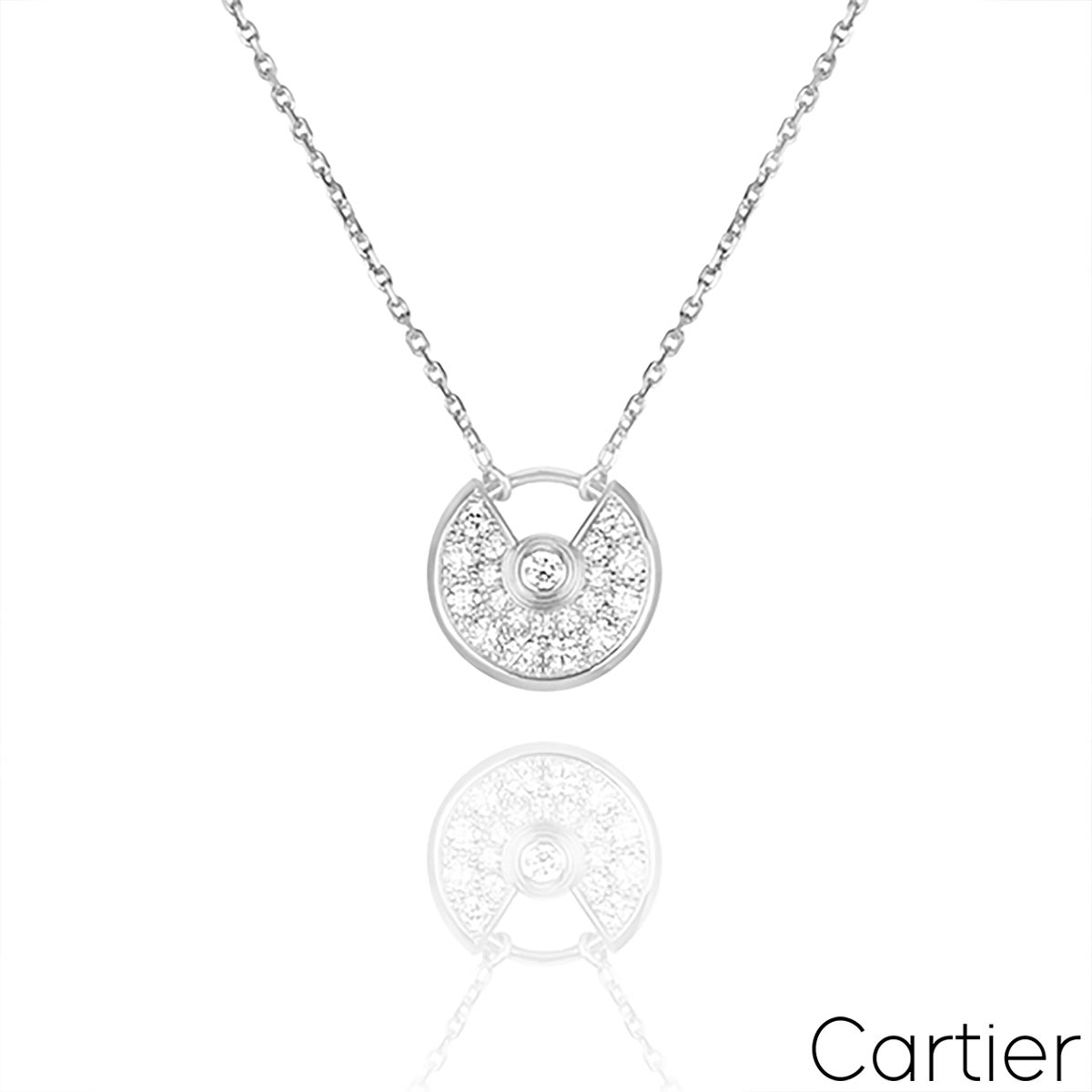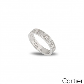 An 18k white gold diamond bracelet by Cartier from the Love collection. The bracelet has the iconic screw motif displayed around the outer edge with 204 round brilliant cut diamonds pave set between each screw motif. The total diamond weight is 1.99ct, all well matched in colour and clarity. The bracelet is a size 18 and has a gross weight of 50 grams.
