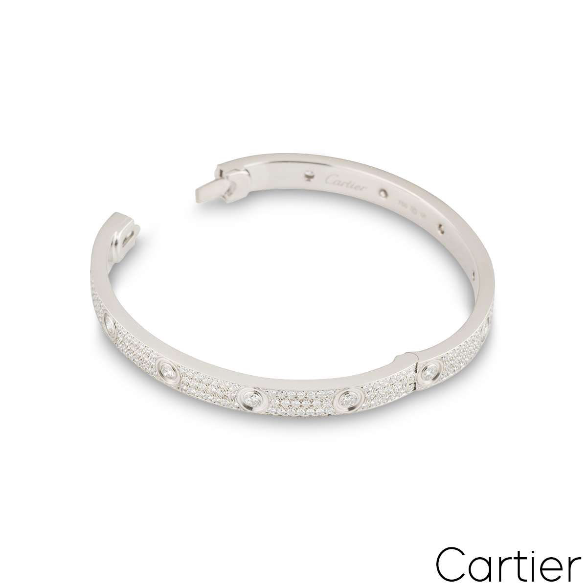 An amazing 18k white gold diamond bracelet by Cartier, from the Love collection. The bracelet has 12 round brilliant cut diamonds around the outer edge and 216 round brilliant cut diamonds pave set between the iconic screw motif design, with an approximate total weight of 3.15ct. Featuring a hinged opening with a push clasp and an additional safety clasp to the side, the 6.7mm wide bracelet is a size 18 and has a gross weight of 48.6 grams.